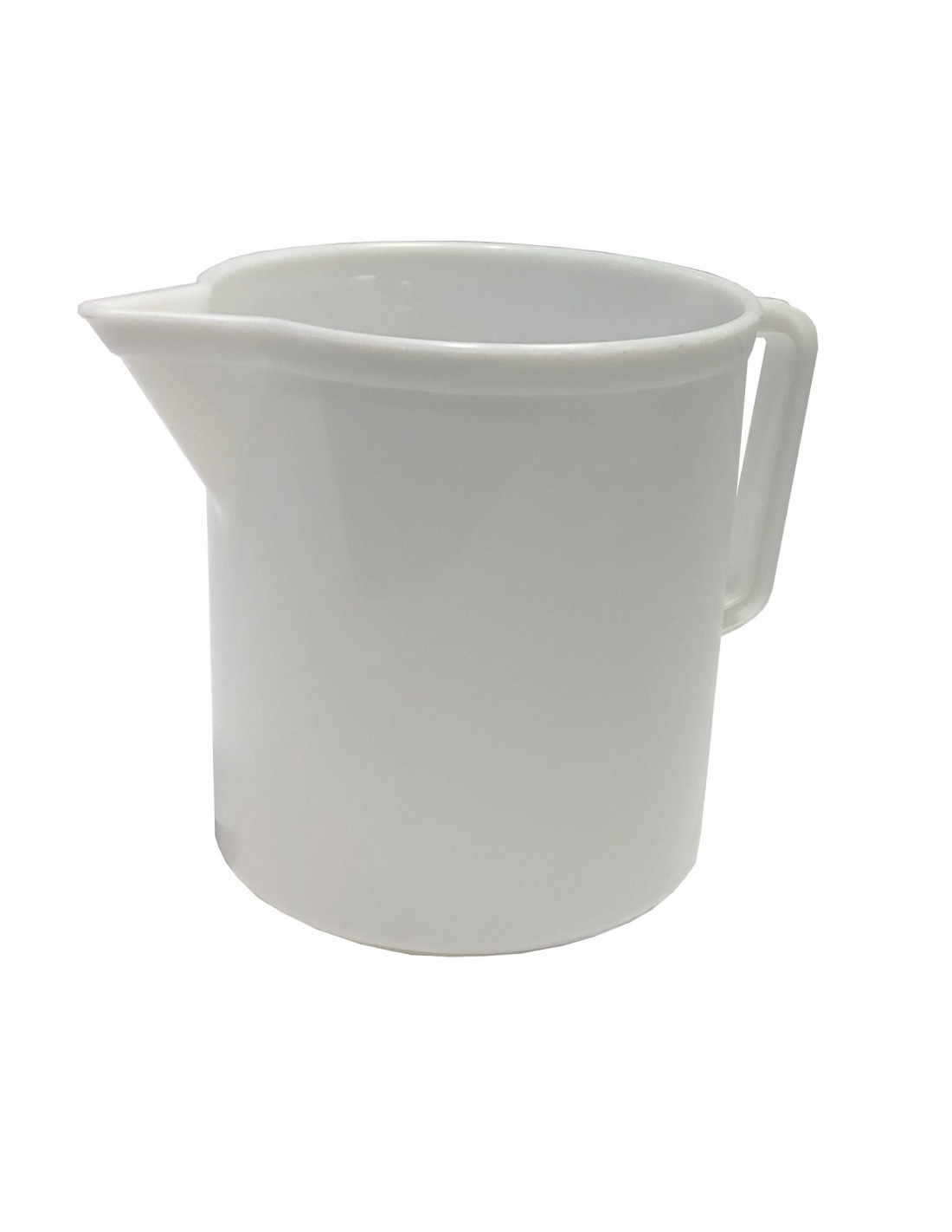 Pratica e robusta caraffa graduata in PP (Polipropilene) con manico, di colore bianco o trasparente. Idonea al contatto con alimenti.