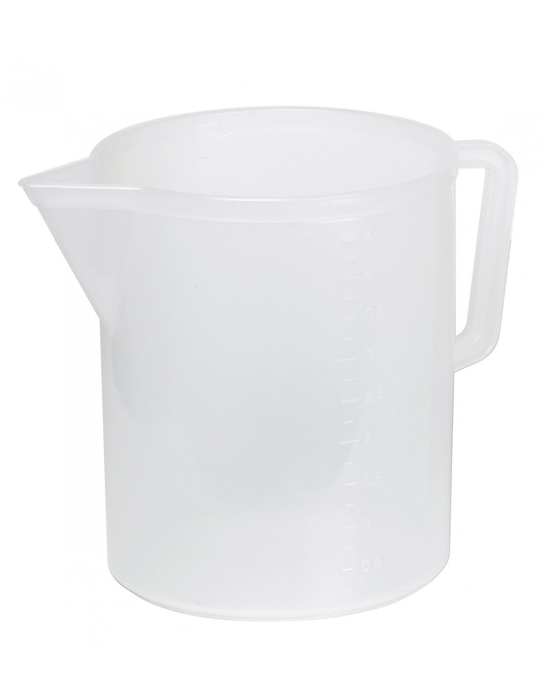 Pratica e robusta caraffa graduata in PP (Polipropilene) con manico, di colore bianco o trasparente. Idonea al contatto con alimenti.