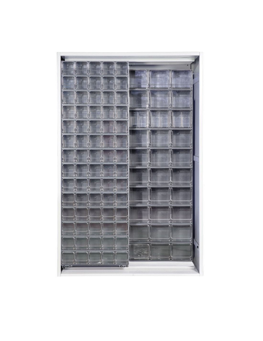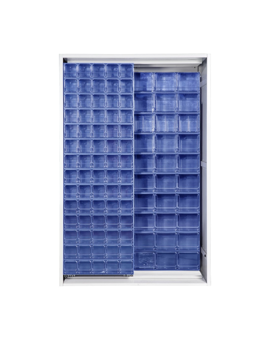 Armadio a pannelli scorrevoli su cuscinetti a sfera. L'armadio è composto da 2 pannelli fissi affiancati sul fondo e 1 pannello scorrevole sul fronte con cassettiere Crystal Box (disponibili nelle varianti di colore: blu, grigio chiaro e grigio scuro). La struttura esterna è realizzata in lamiera elettrosaldata con barre di rinforzo e verniciata a forno con polvere epossidica di colore "GRIGIO". L'armadio viene fornito smontato con manuale di assemblaggio e viteria.