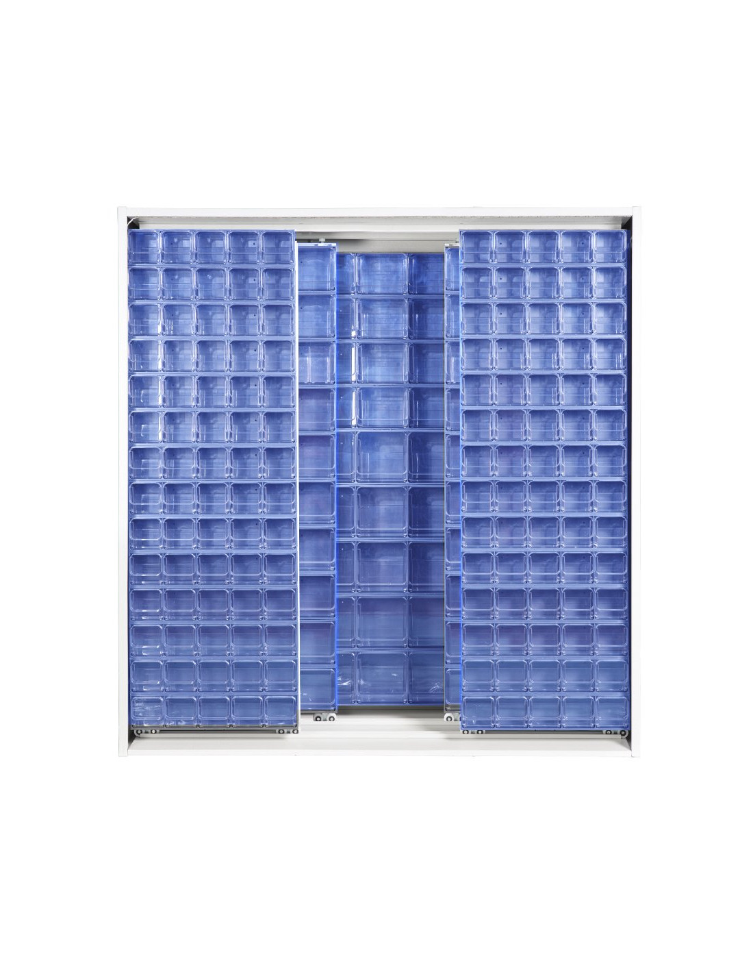 Armadio a pannelli scorrevoli su cuscinetti a sfera. L'armadio è composto da 3 pannelli fissi affiancati sul fondo e 4 pannelli scorrevoli con cassettiere Crystal Box (disponibili nelle varianti di colore: blu, grigio chiaro e grigio scuro). La struttura esterna è realizzata in lamiera elettrosaldata con barre di rinforzo e verniciata a forno con polvere epossidica di colore "GRIGIO". L'armadio viene fornito smontato con manuale di assemblaggio e viteria.