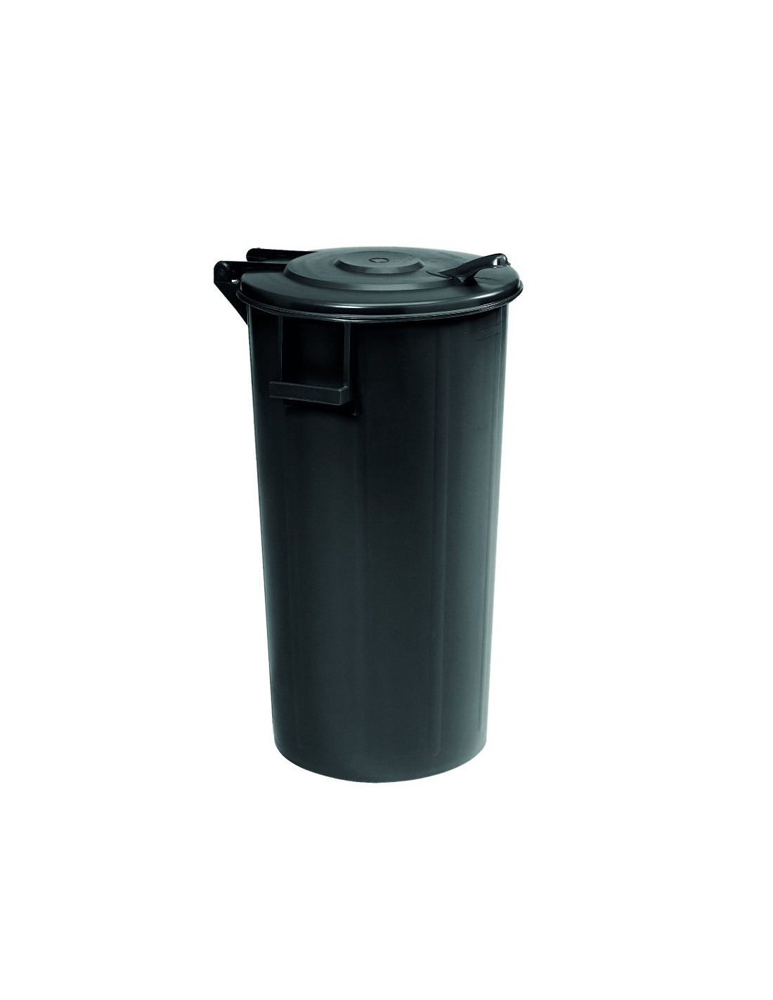 Pratico bidone industriale in PEHD (Polietilene ad alta densità) di colore nero, con coperchio a cerniera integrato.