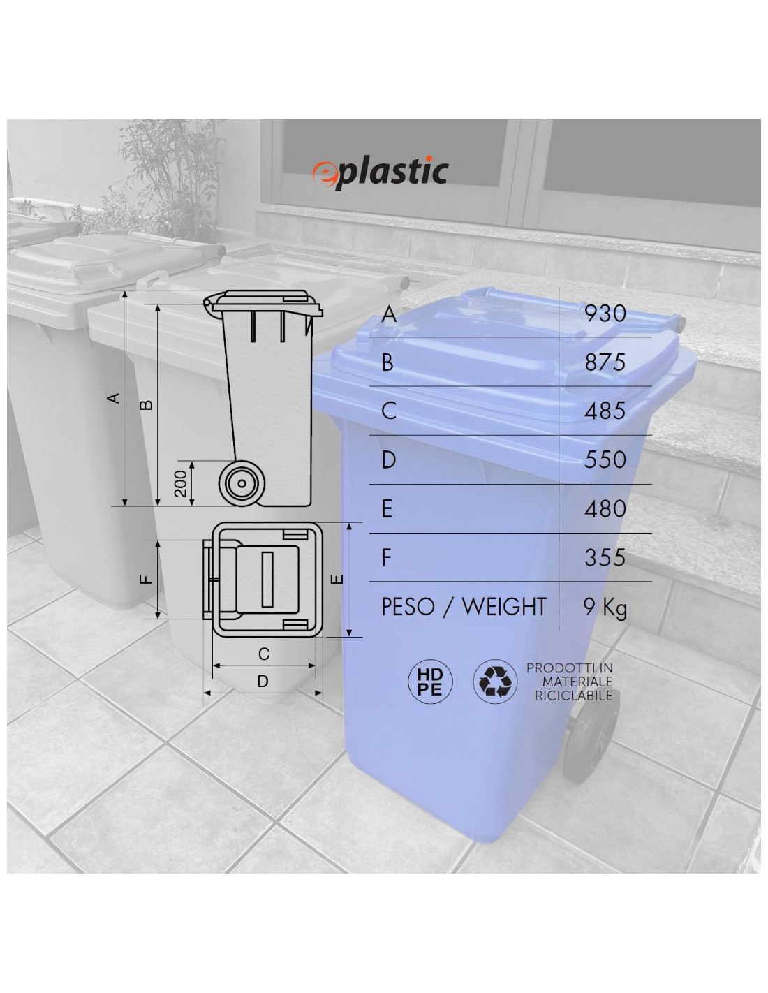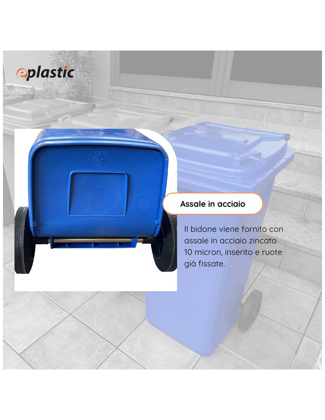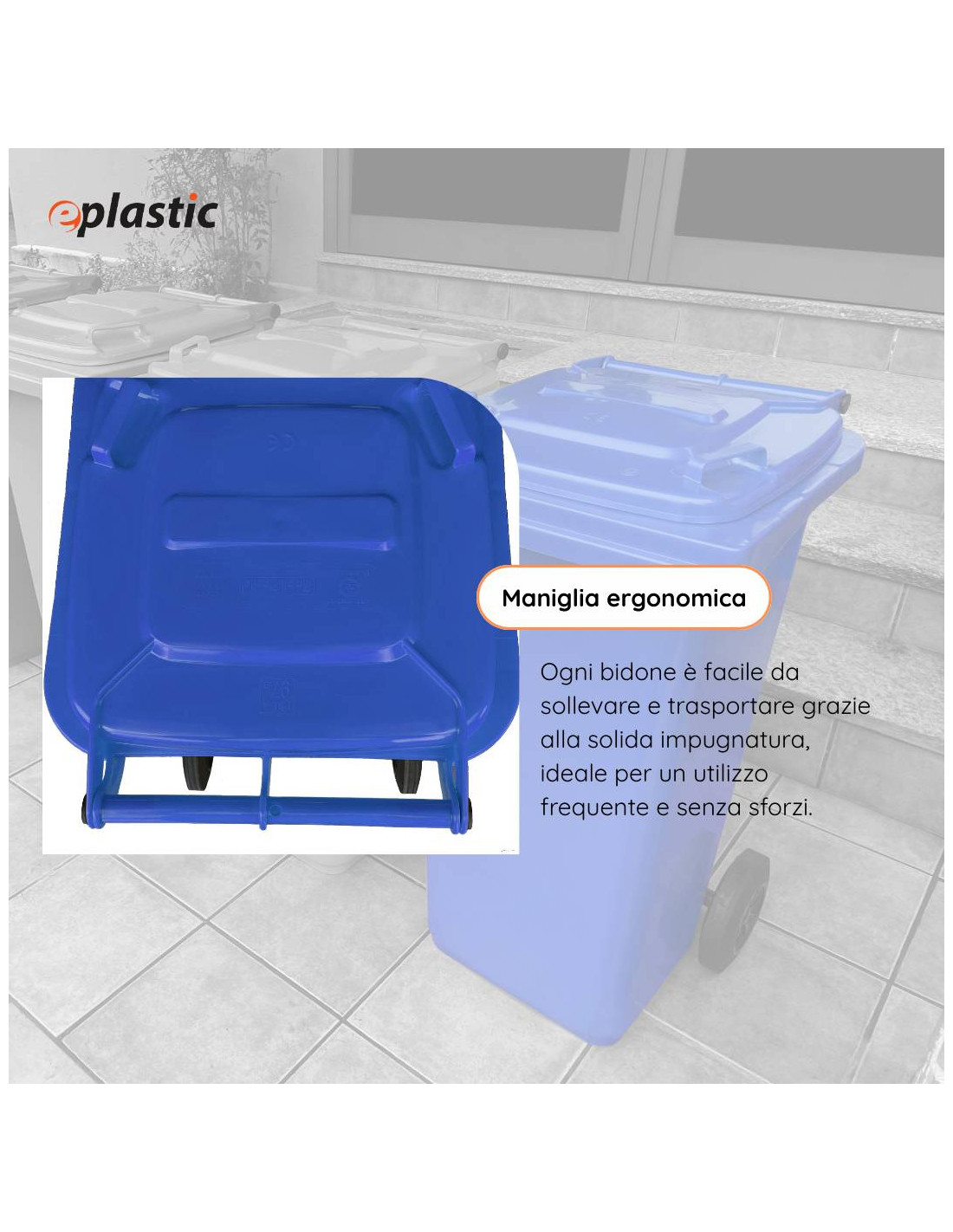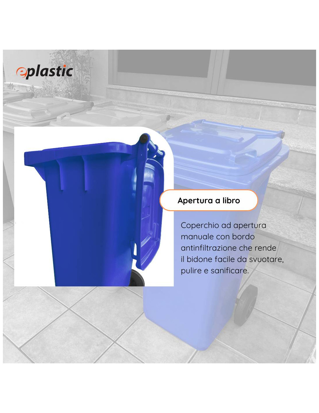 Il bidone carrellato da 120 litri è la soluzione ideale per la raccolta differenziata dei rifiuti in contesti pubblici, industriali e residenziali. Realizzato in PEHD (polietilene ad alta densità), offre massima resistenza agli urti, all'usura, agli agenti chimici e alle condizioni climatiche più estreme, come gelo e calore. Grazie alle sue due ruote robuste e alla presa frontale tipo A, conforme alla normativa UNI EN 840, il contenitore è facilmente movimentabile e compatibile con i principali sistemi di svuotamento meccanico. Il coperchio ad apertura manuale garantisce praticità e igiene nell'utilizzo quotidiano. Il bidone è progettato per un uso intensivo all'esterno, perfetto per condomini, giardini, aziende, scuole e spazi pubblici. I diversi colori aiutano ad identificare facilmente la tipologia di rifiuto secondo le normative sulla raccolta differenziata.