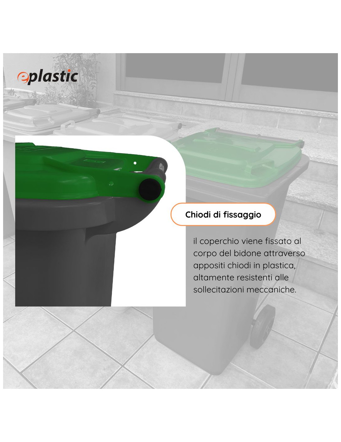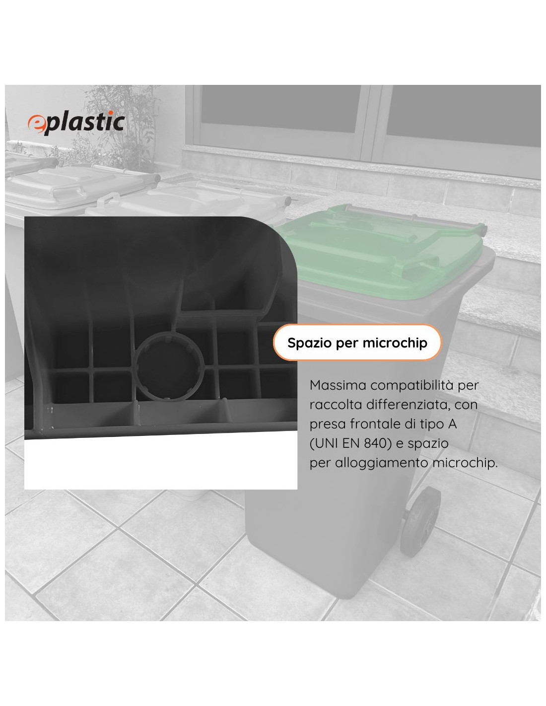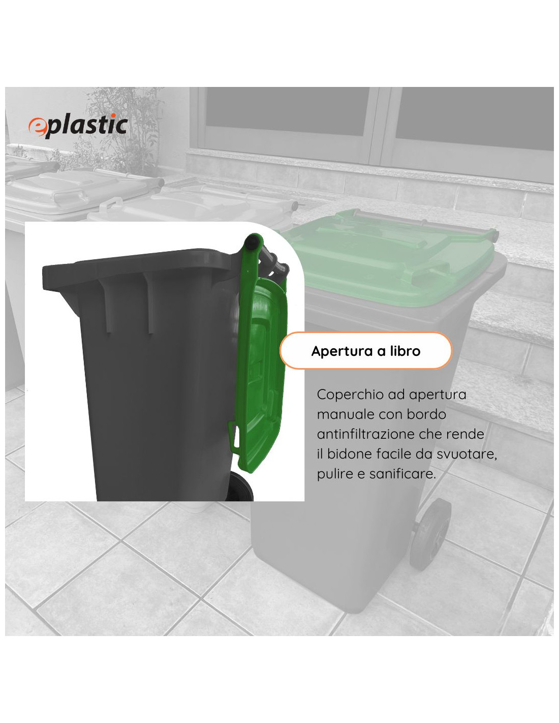 Il bidone carrellato da 240 litri è la soluzione ideale per la raccolta differenziata dei rifiuti in contesti pubblici, industriali e residenziali. Realizzato in PEHD (polietilene ad alta densità), offre massima resistenza agli urti, all'usura, agli agenti chimici e alle condizioni climatiche più estreme, come gelo e calore. Grazie alle sue due ruote robuste e alla presa frontale tipo A, conforme alla normativa UNI EN 840, il contenitore è facilmente movimentabile e compatibile con i principali sistemi di svuotamento meccanico. Il coperchio ad apertura manuale garantisce praticità e igiene nell'utilizzo quotidiano. Il bidone è progettato per un uso intensivo all'esterno, perfetto per condomini, giardini, aziende, scuole e spazi pubblici. I diveris colori aiutano ad identificare facilmente la tipologia di rifiuto secondo le normative sulla raccolta differenziata.