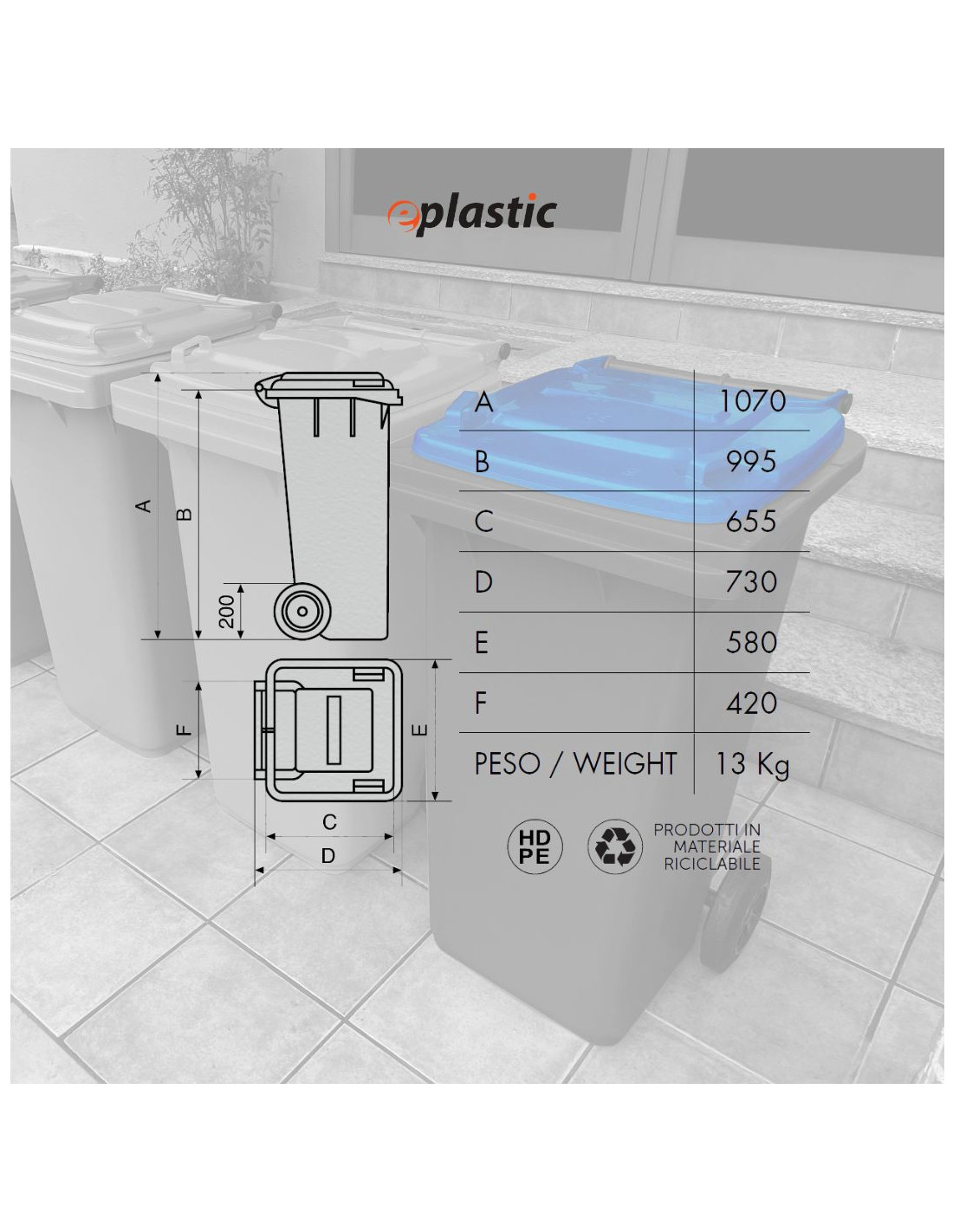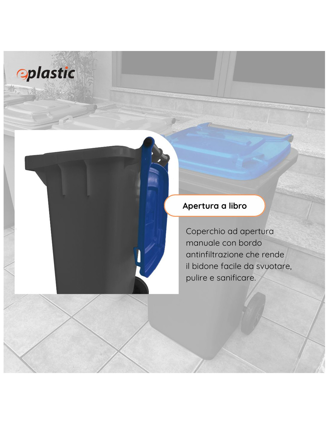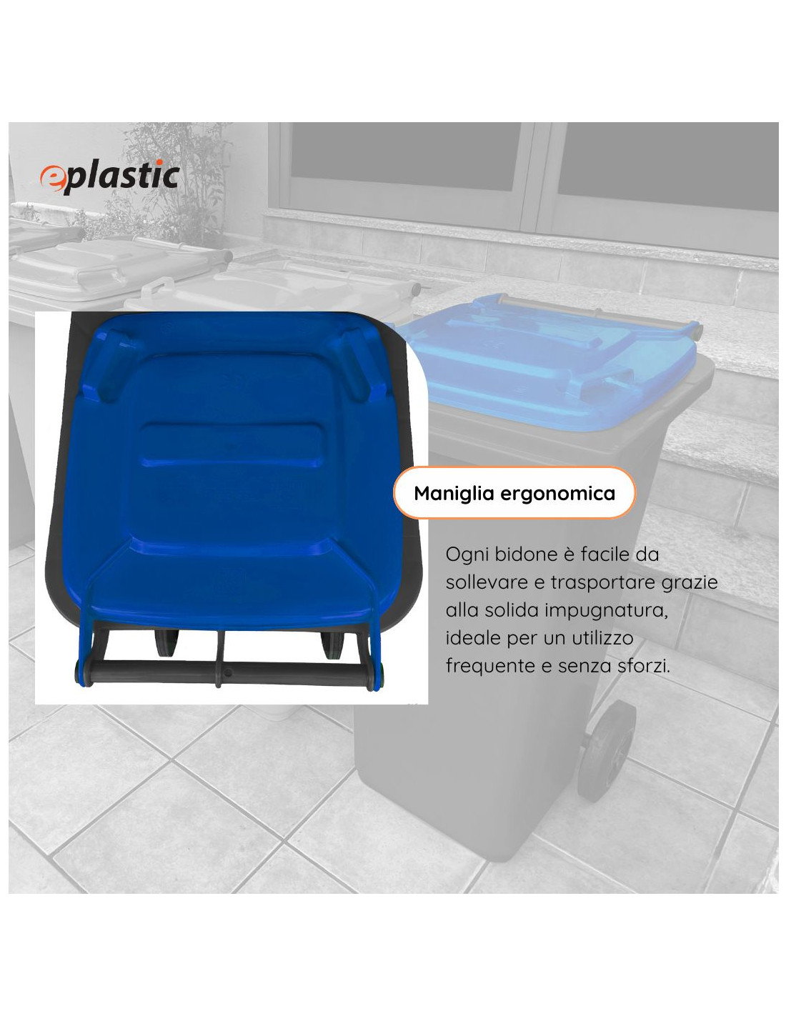 Il bidone carrellato da 240 litri è la soluzione ideale per la raccolta differenziata dei rifiuti in contesti pubblici, industriali e residenziali. Realizzato in PEHD (polietilene ad alta densità), offre massima resistenza agli urti, all'usura, agli agenti chimici e alle condizioni climatiche più estreme, come gelo e calore. Grazie alle sue due ruote robuste e alla presa frontale tipo A, conforme alla normativa UNI EN 840, il contenitore è facilmente movimentabile e compatibile con i principali sistemi di svuotamento meccanico. Il coperchio ad apertura manuale garantisce praticità e igiene nell'utilizzo quotidiano. Il bidone è progettato per un uso intensivo all'esterno, perfetto per condomini, giardini, aziende, scuole e spazi pubblici. I diveris colori aiutano ad identificare facilmente la tipologia di rifiuto secondo le normative sulla raccolta differenziata.