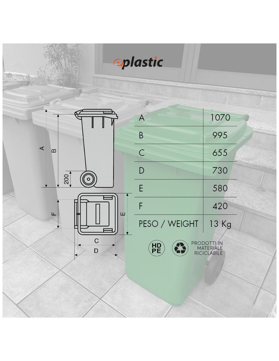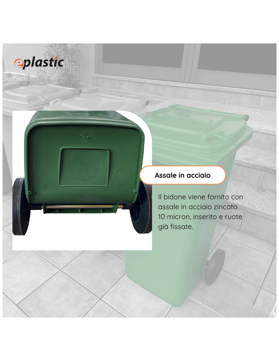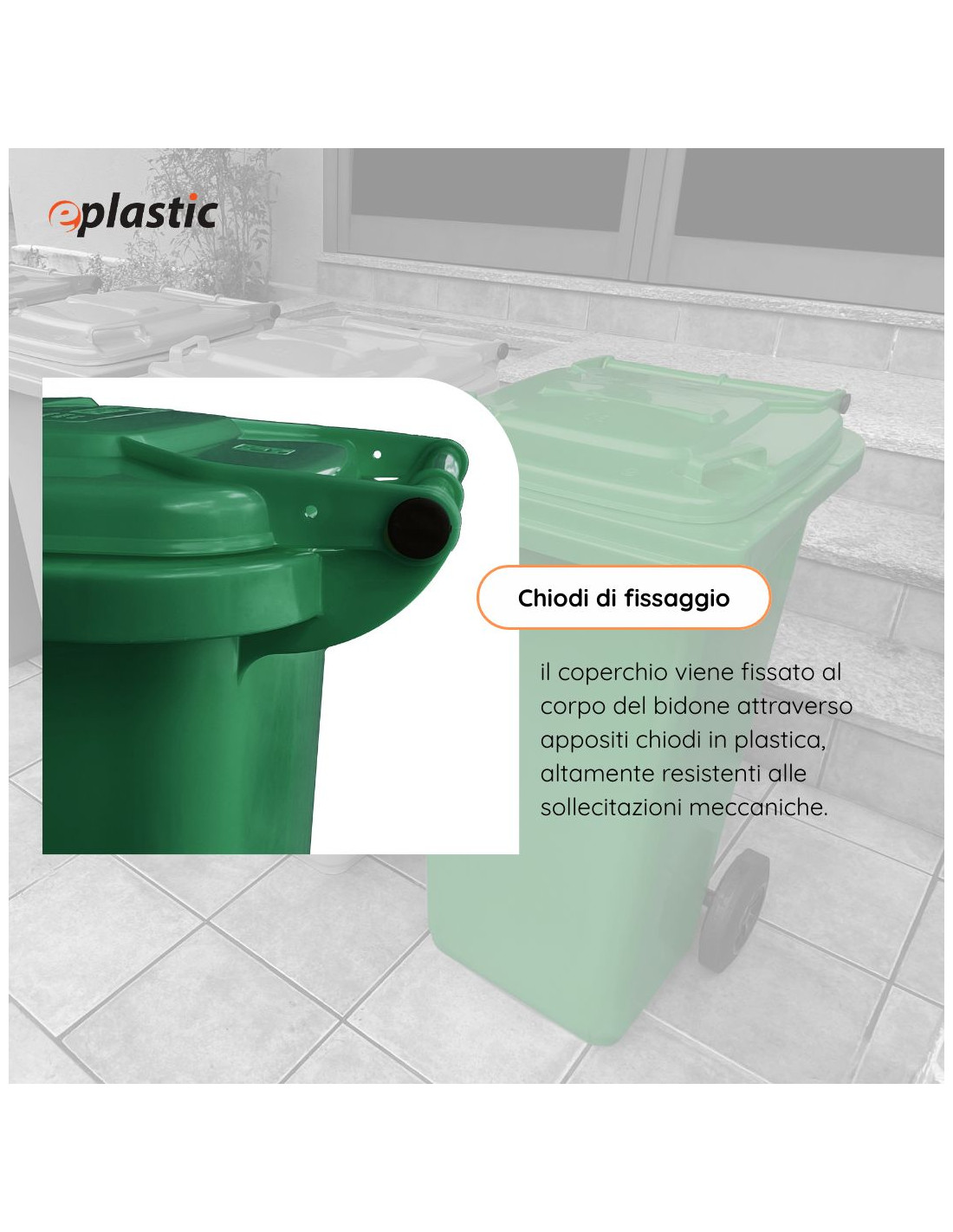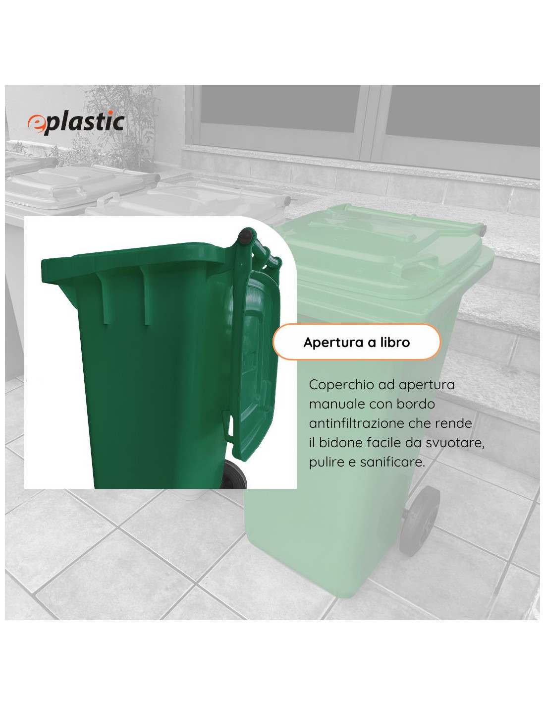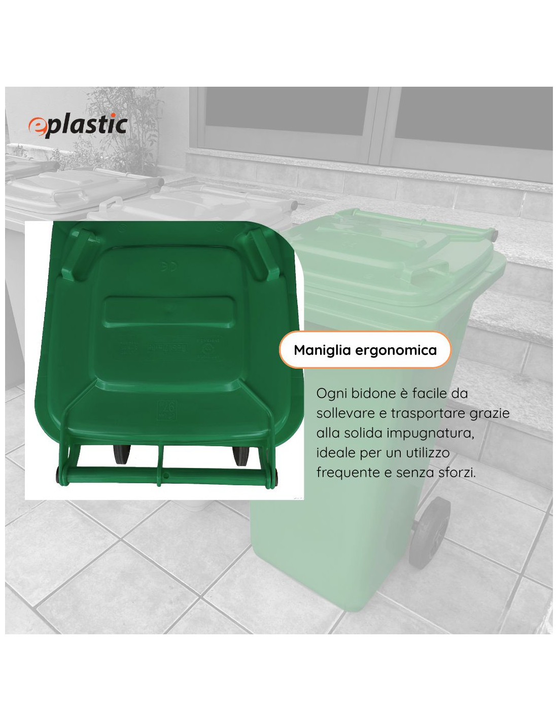 Il bidone carrellato da 240 litri è la soluzione ideale per la raccolta differenziata dei rifiuti in contesti pubblici, industriali e residenziali. Realizzato in PEHD (polietilene ad alta densità), offre massima resistenza agli urti, all'usura, agli agenti chimici e alle condizioni climatiche più estreme, come gelo e calore. Grazie alle sue due ruote robuste e alla presa frontale tipo A, conforme alla normativa UNI EN 840, il contenitore è facilmente movimentabile e compatibile con i principali sistemi di svuotamento meccanico. Il coperchio ad apertura manuale garantisce praticità e igiene nell'utilizzo quotidiano. Il bidone è progettato per un uso intensivo all'esterno, perfetto per condomini, giardini, aziende, scuole e spazi pubblici. I diveris colori aiutano ad identificare facilmente la tipologia di rifiuto secondo le normative sulla raccolta differenziata.