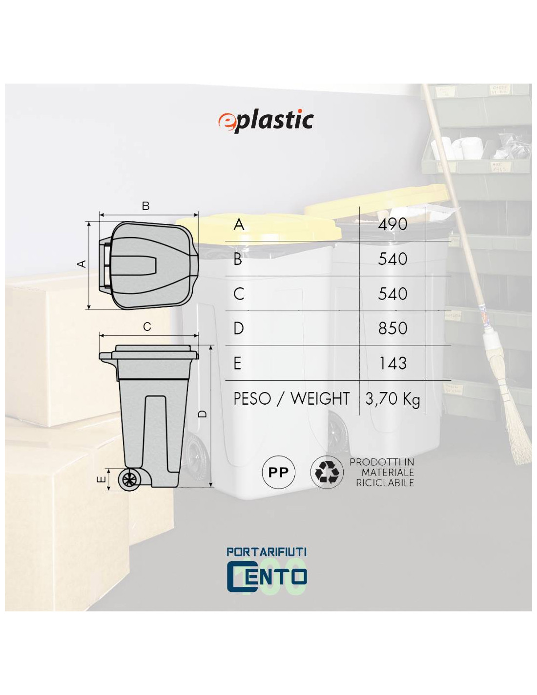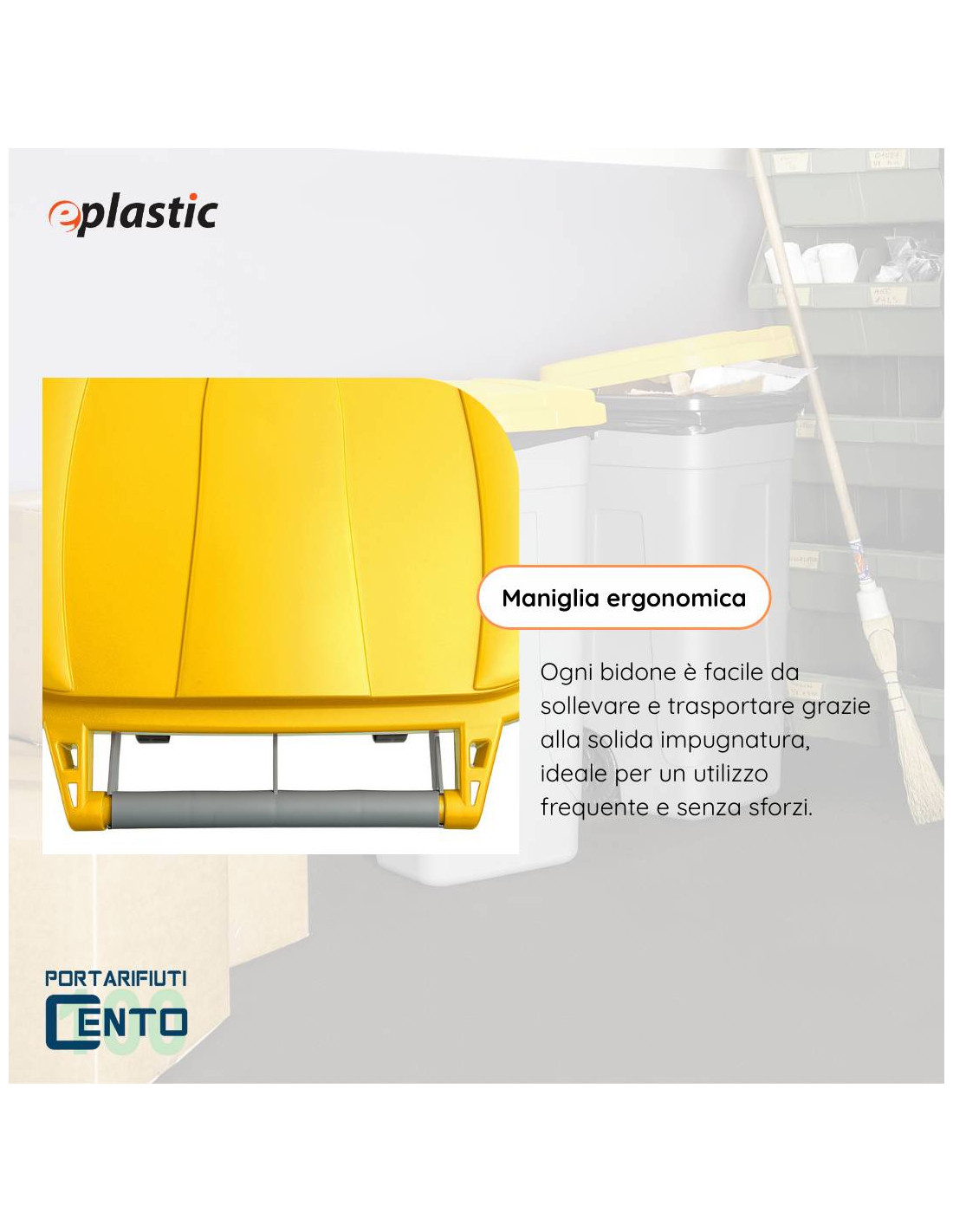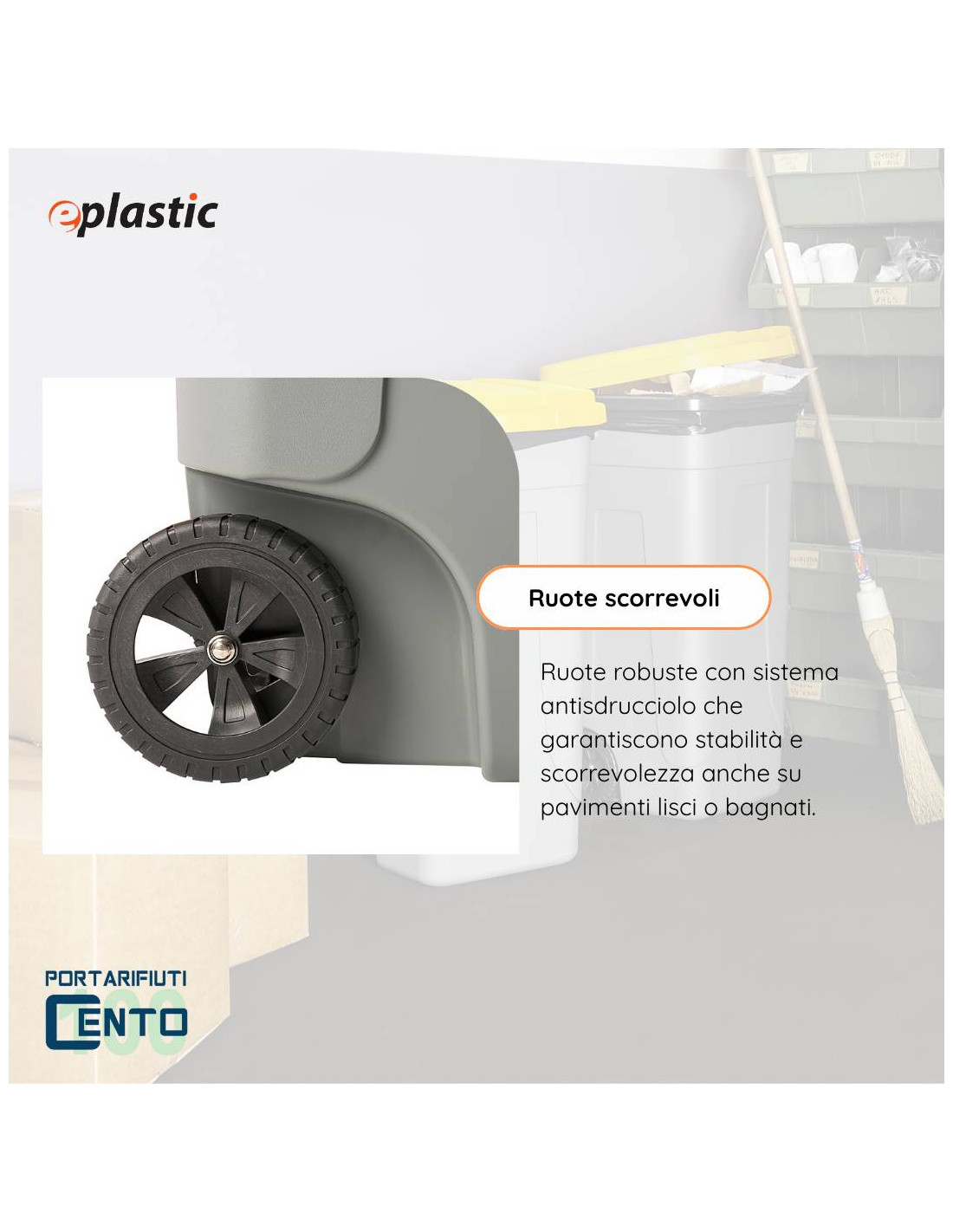 Pratico bidone porta rifiuti da 100 litri con due ruote e coperchio ad apertura 270°, realizzato in PP (copolimero di Polipropilene) con design moderno e funzionale.