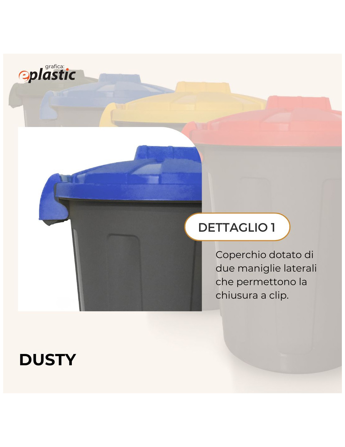 Pratico bidone porta rifiuti da 25 litri in PP (Polipropilene) disponibile nella variante bicolor con fondo grigio e coperchio dotato di chiusura a clip colorato: blu, giallo, rosso e verde scuro. Il design moderno permette a Dusty di adattarsi facilmente a tutti gli ambienti.