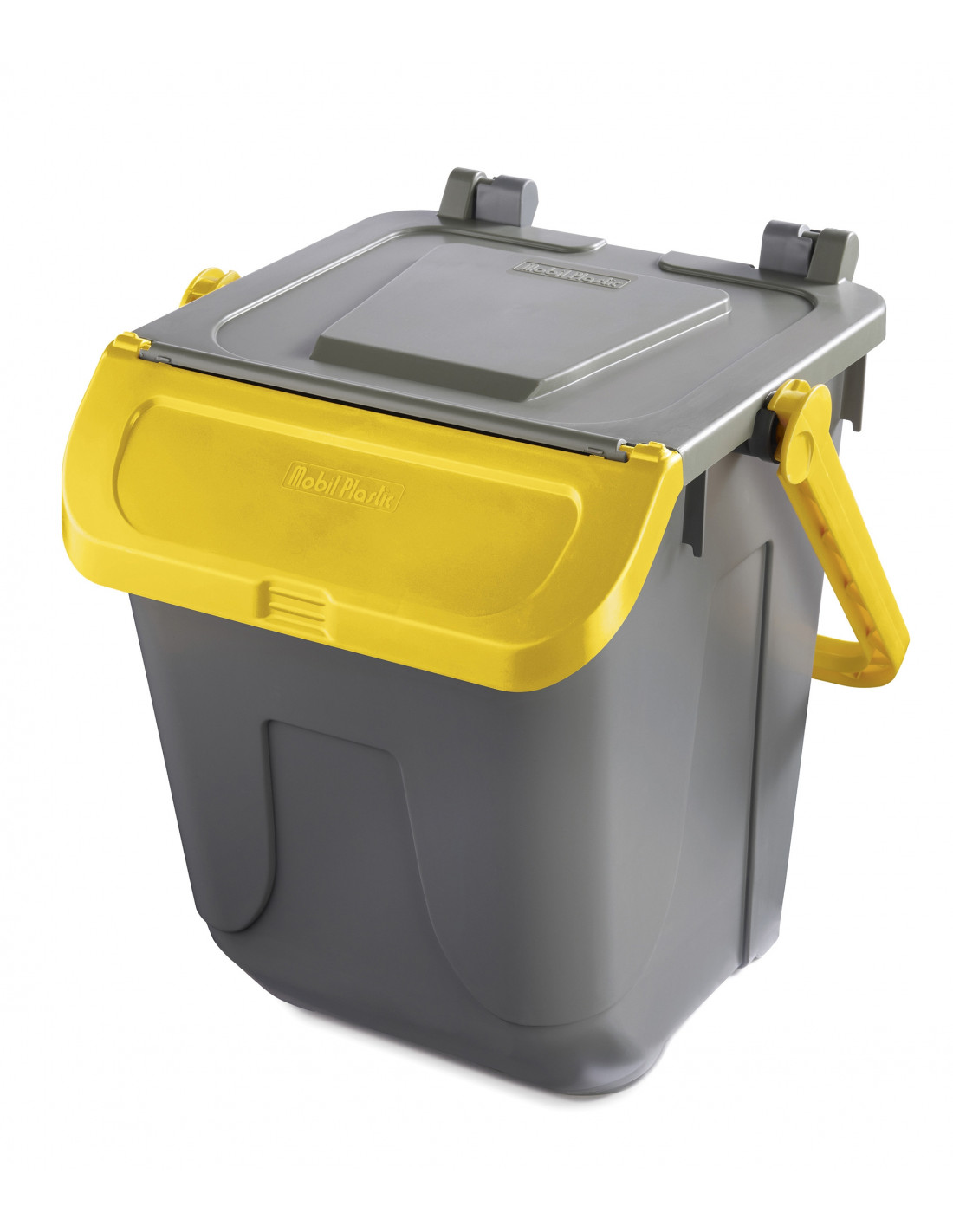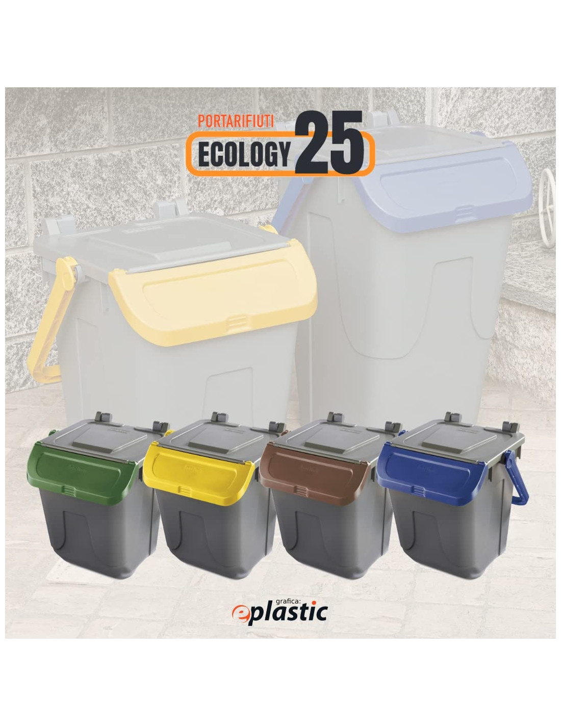 Pratico e robusto contenitore porta rifiuti, ideale per la raccolta differenziata urbana e domestica. Disponibile con fondo grigio e coperchio colorato (blu, giallo, marrone o verde). Capacità: 25 litri