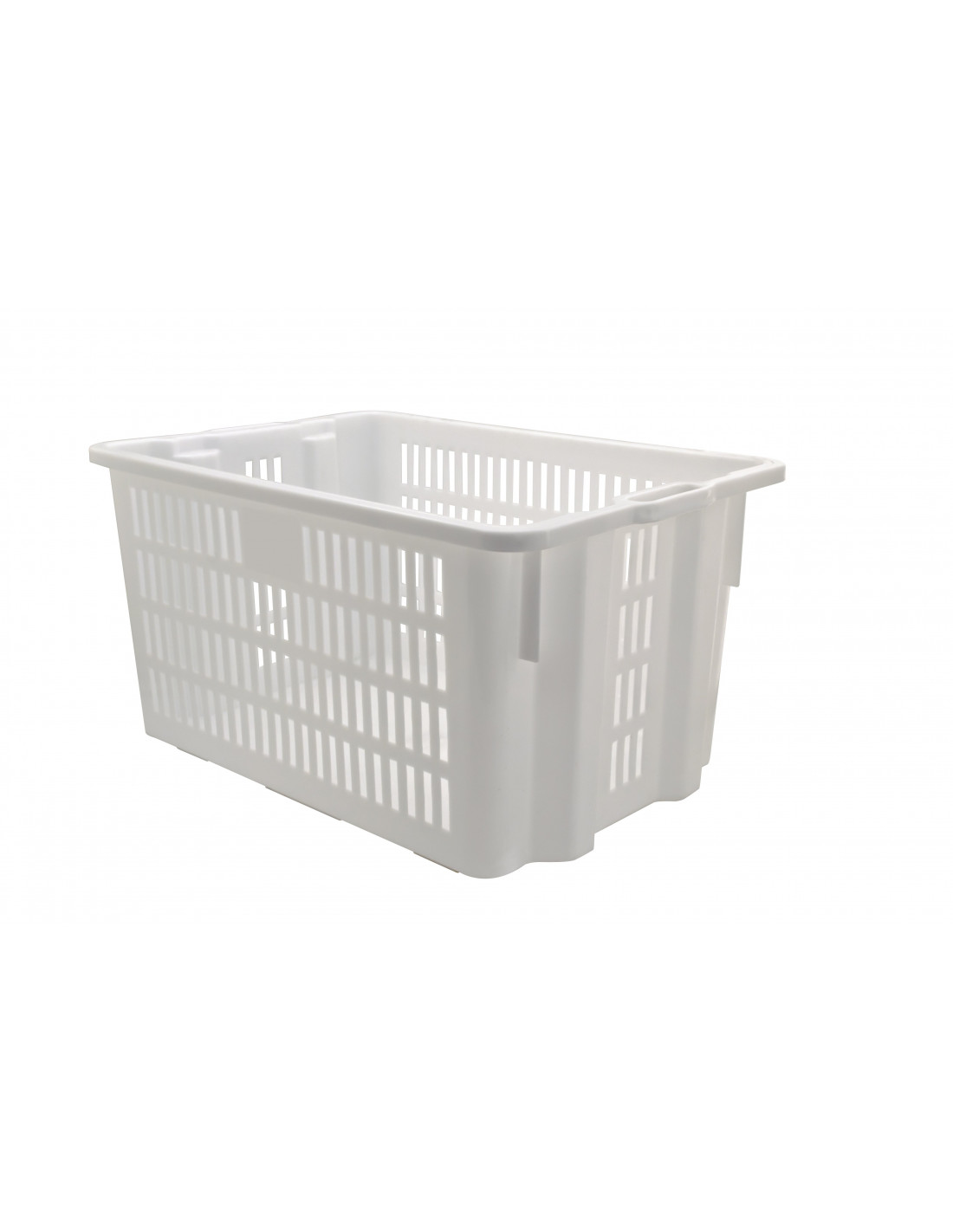 Cassa forata inseribile e sovrapponibile in PEHD (Polietilene ad alta densità) di colore bianco neutro, idonea al contatto alimentare.