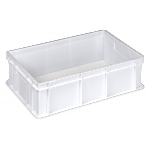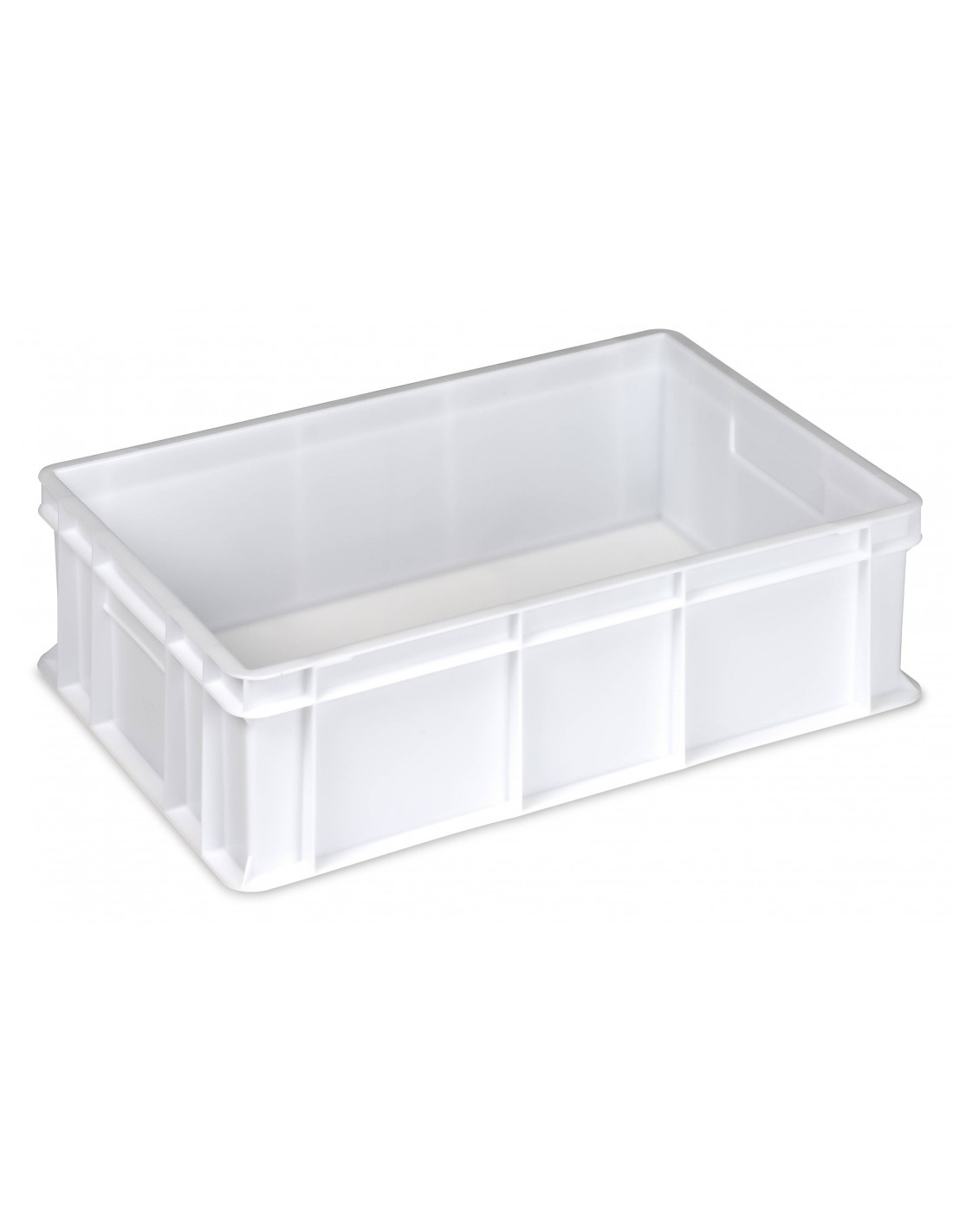 Cassa sovrapponibile ed impilabile con fondo e pareti pieni in PP (Polipropilene), di colore bianco neutro.