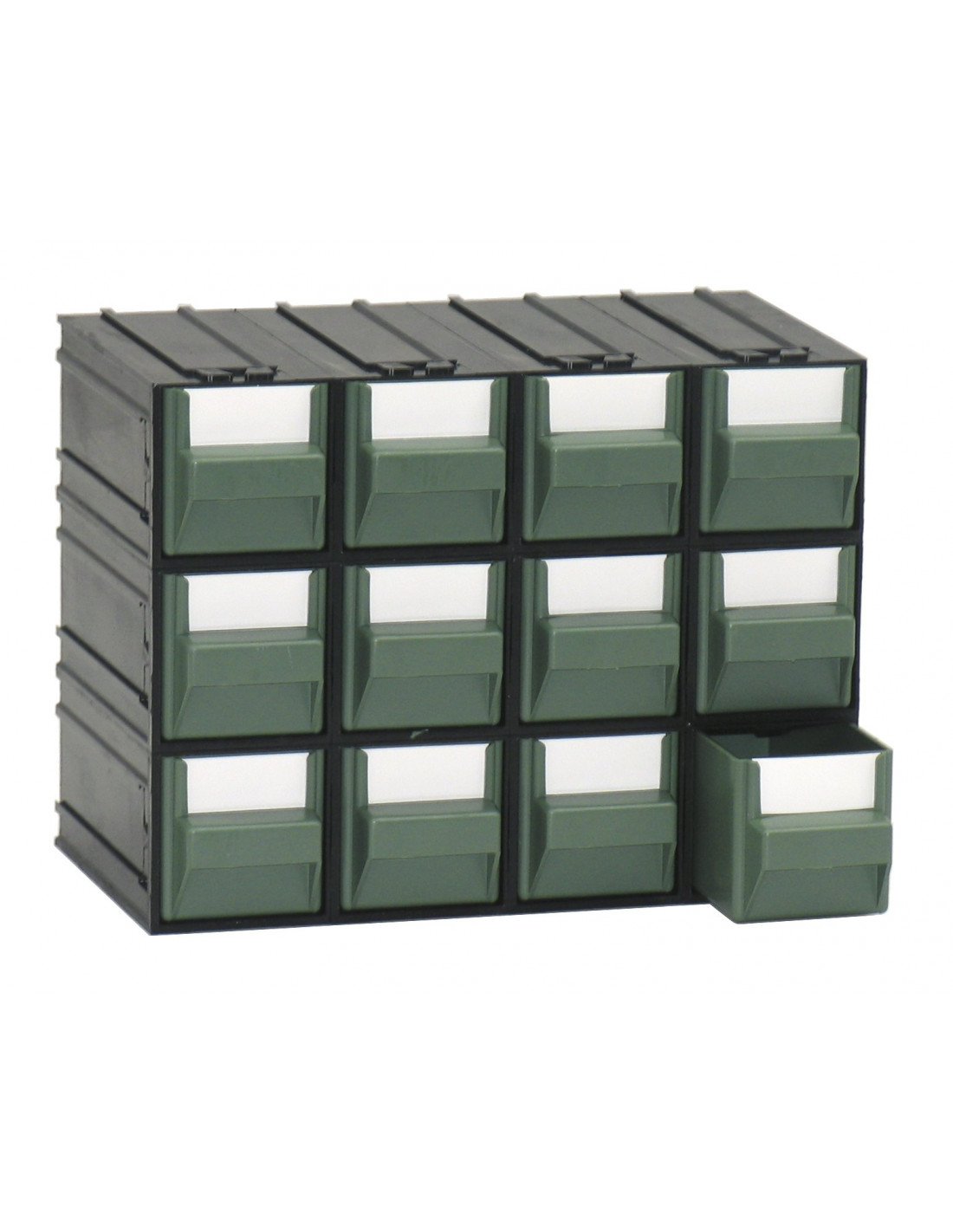 Cassettiera modulare realizzata in PST (Polistirene) ideale per contenere minuteria. Corpo esterno nero e 12 cassettini verdi.