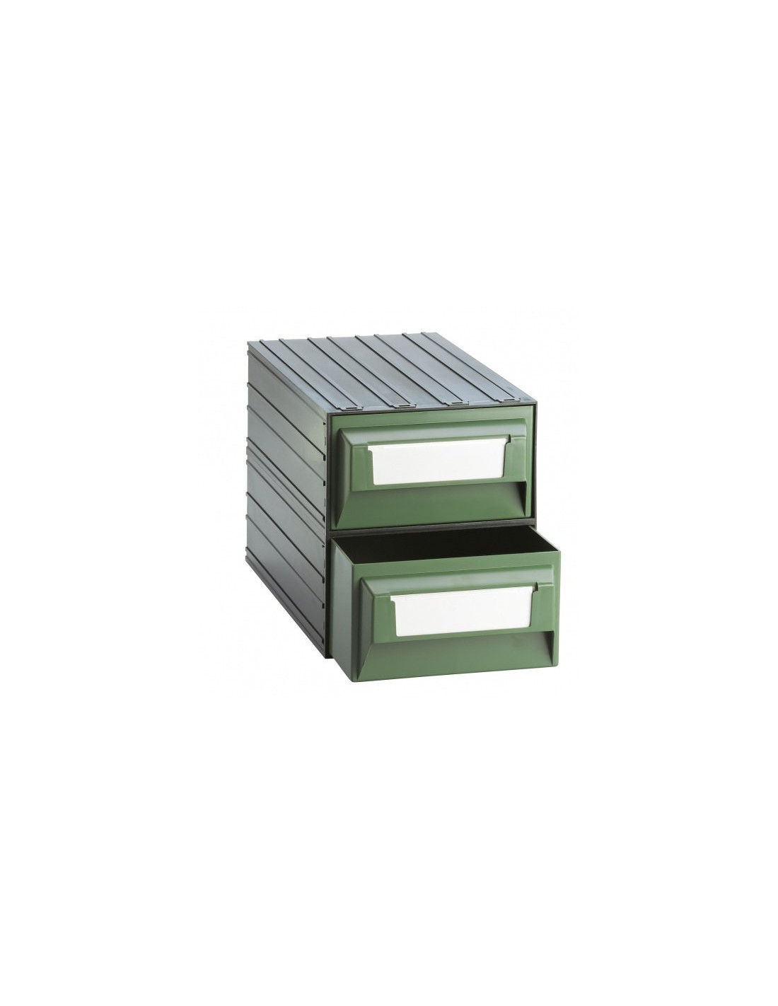 Cassettiera modulare realizzata in PST (Polistirene) ideale per contenere minuteria. Corpo esterno nero e 2 cassetti verdi.
