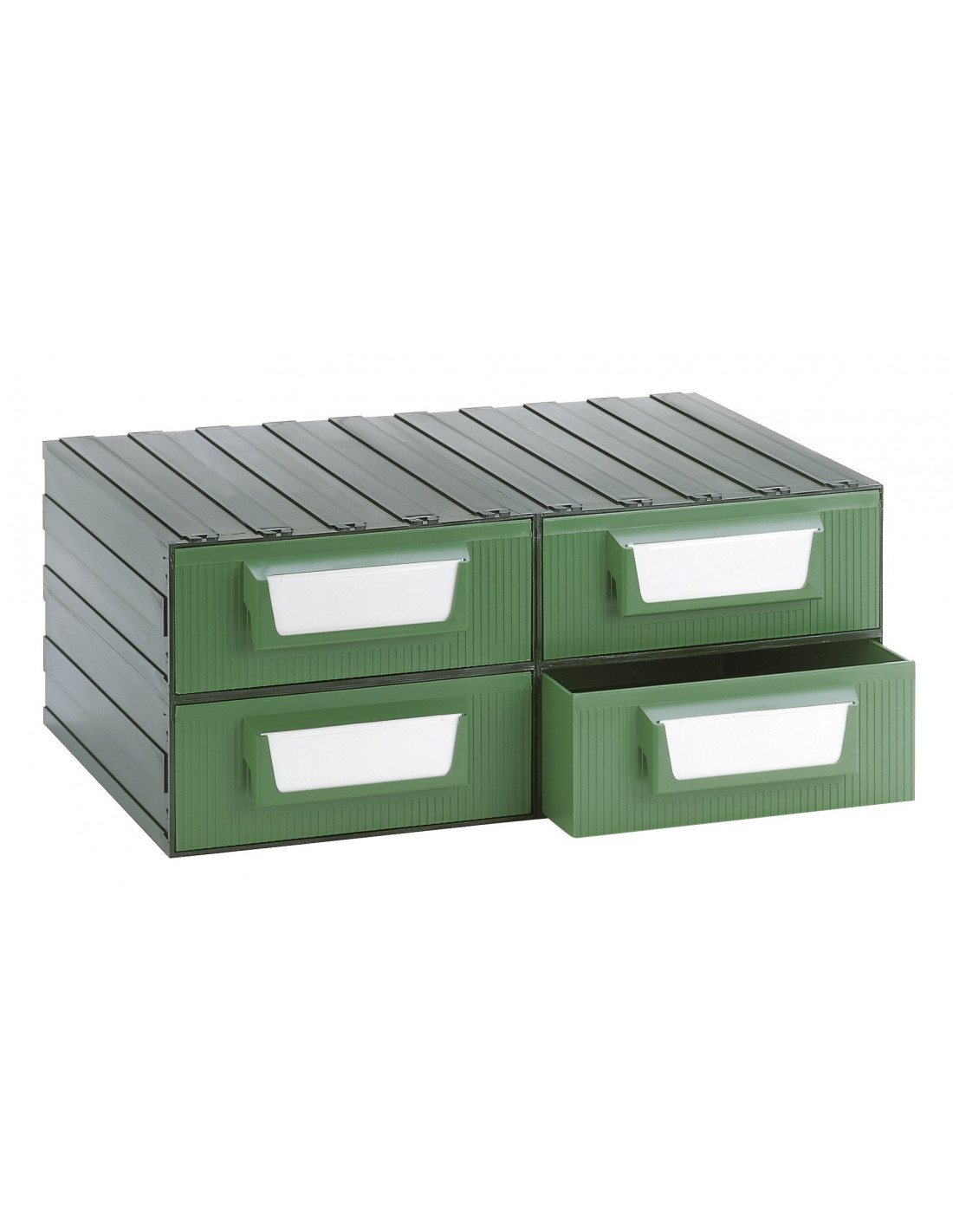 Cassettiera modulare realizzata in PST (Polistirene) ideale per contenere minuteria. Corpo esterno nero e 4 cassetti verdi.