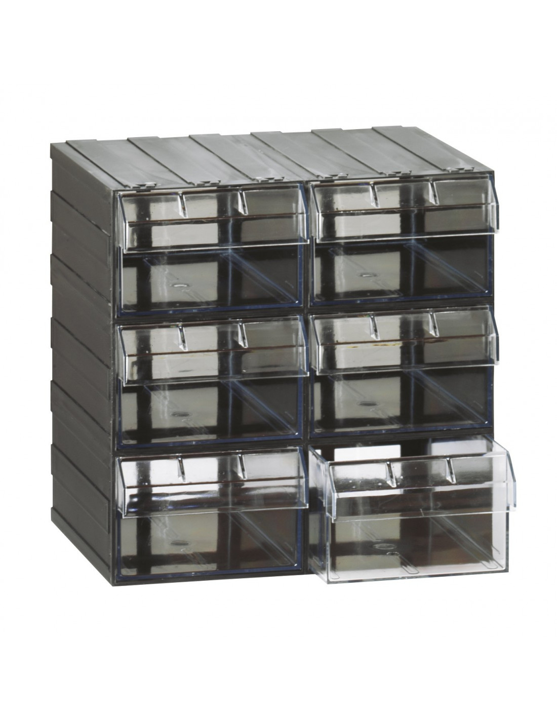 Cassettiera modulare realizzata in PST (Polistirene) ideale per contenere minuteria. Corpo esterno nero e 6 cassetti trasparenti.