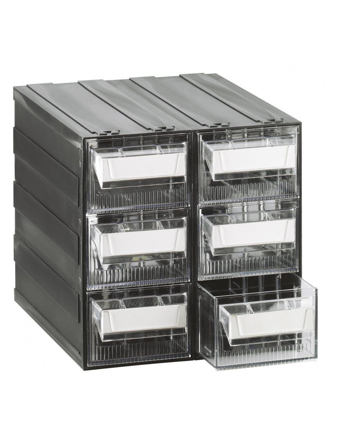 Cassettiera modulare realizzata in PST (Polistirene) ideale per contenere minuteria. Corpo esterno nero e 6 cassetti trasparenti.