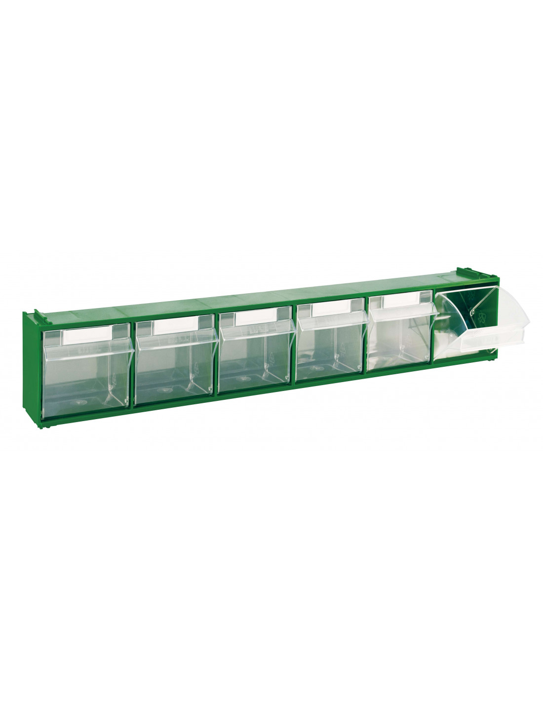 Cassettiera sovrapponibile con 6 cassetti estraibili ad apertura basculante. Il corpo esterno è realizzato in PST AU (Polistirolo antiurto) disponibile nelle varianti di colore verde o rosso, mentre il cassetto interno in copolimero di stirene trasparente.