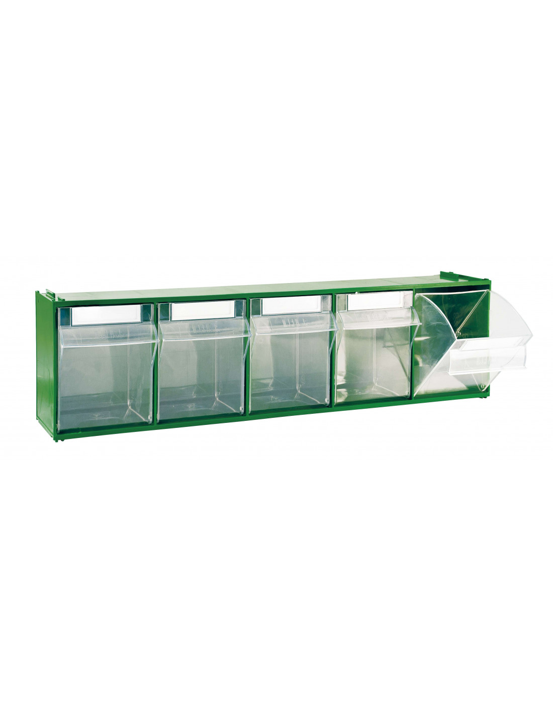 Cassettiera sovrapponibile con 5 cassetti estraibili ad apertura basculante. Il corpo esterno è realizzato in PST AU (Polistirolo antiurto) disponibile nelle varianti di colore verde o rosso, mentre il cassetto interno in copolimero di stirene trasparente.