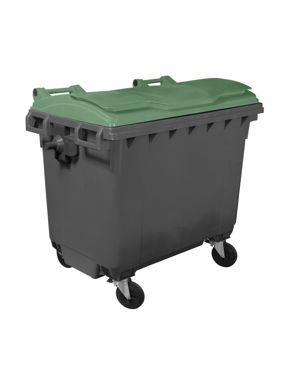 Cassonetto 4 ruote da esterno porta rifiuti in PEHD (Polietilene ad alta densità) con coperchio piano, capacità lt. 660, dotato di quattro ruote in gomma con diametro 200 mm e relativo sistema di bloccaggio.