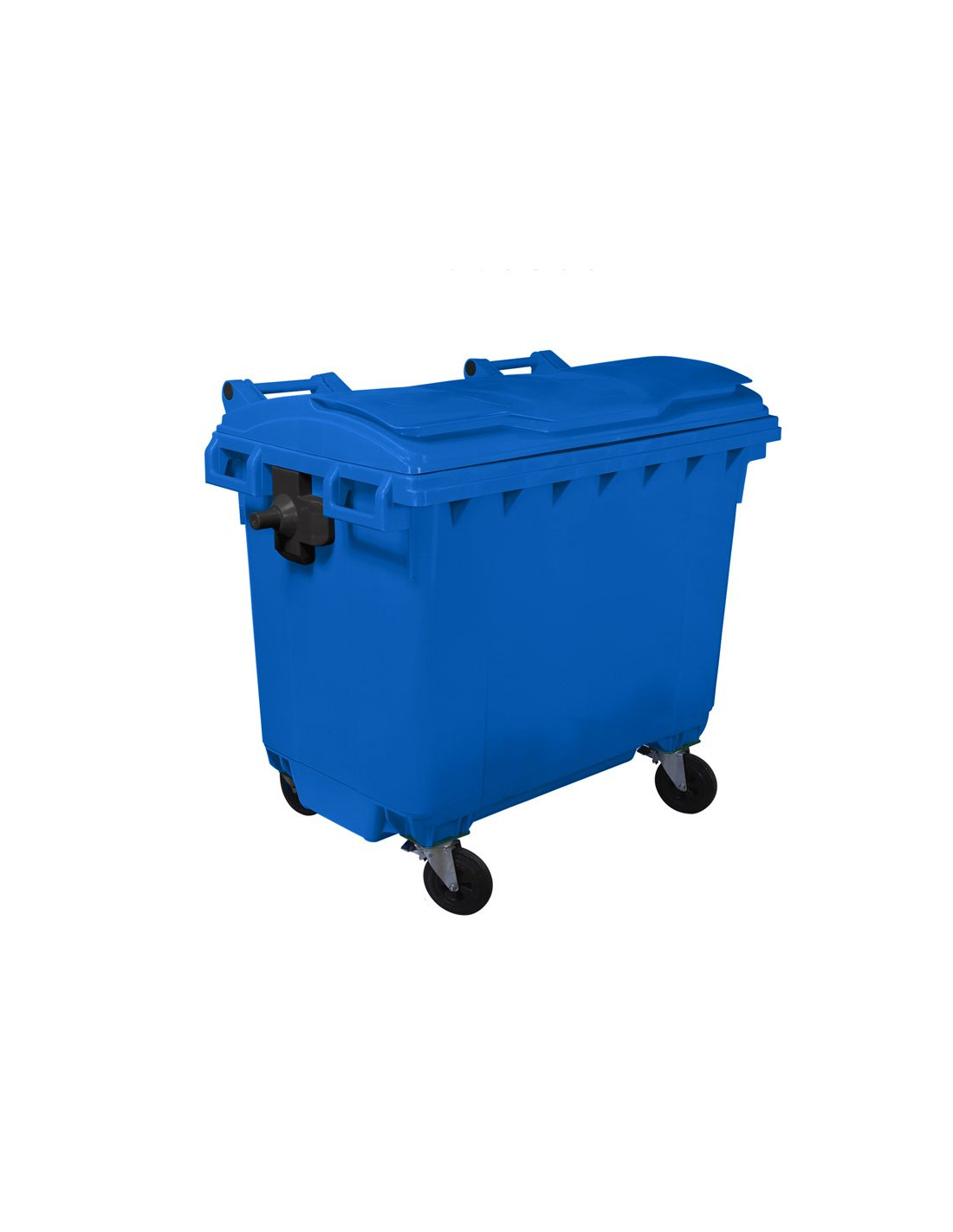 Cassonetto 4 ruote da esterno porta rifiuti in PEHD (Polietilene ad alta densità) con coperchio piano, capacità lt. 660, dotato di quattro ruote in gomma con diametro 200 mm e relativo sistema di bloccaggio.