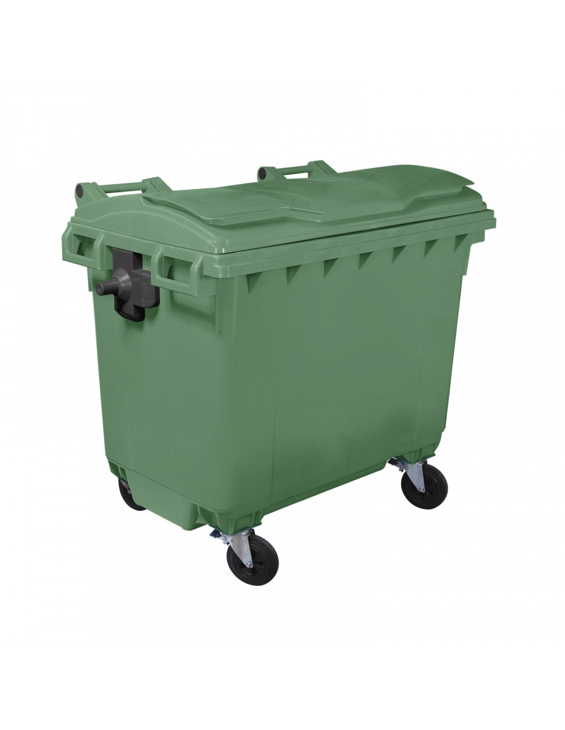 Cassonetto 4 ruote da esterno porta rifiuti in PEHD (Polietilene ad alta densità) con coperchio piano, capacità lt. 660, dotato di quattro ruote in gomma con diametro 200 mm e relativo sistema di bloccaggio.