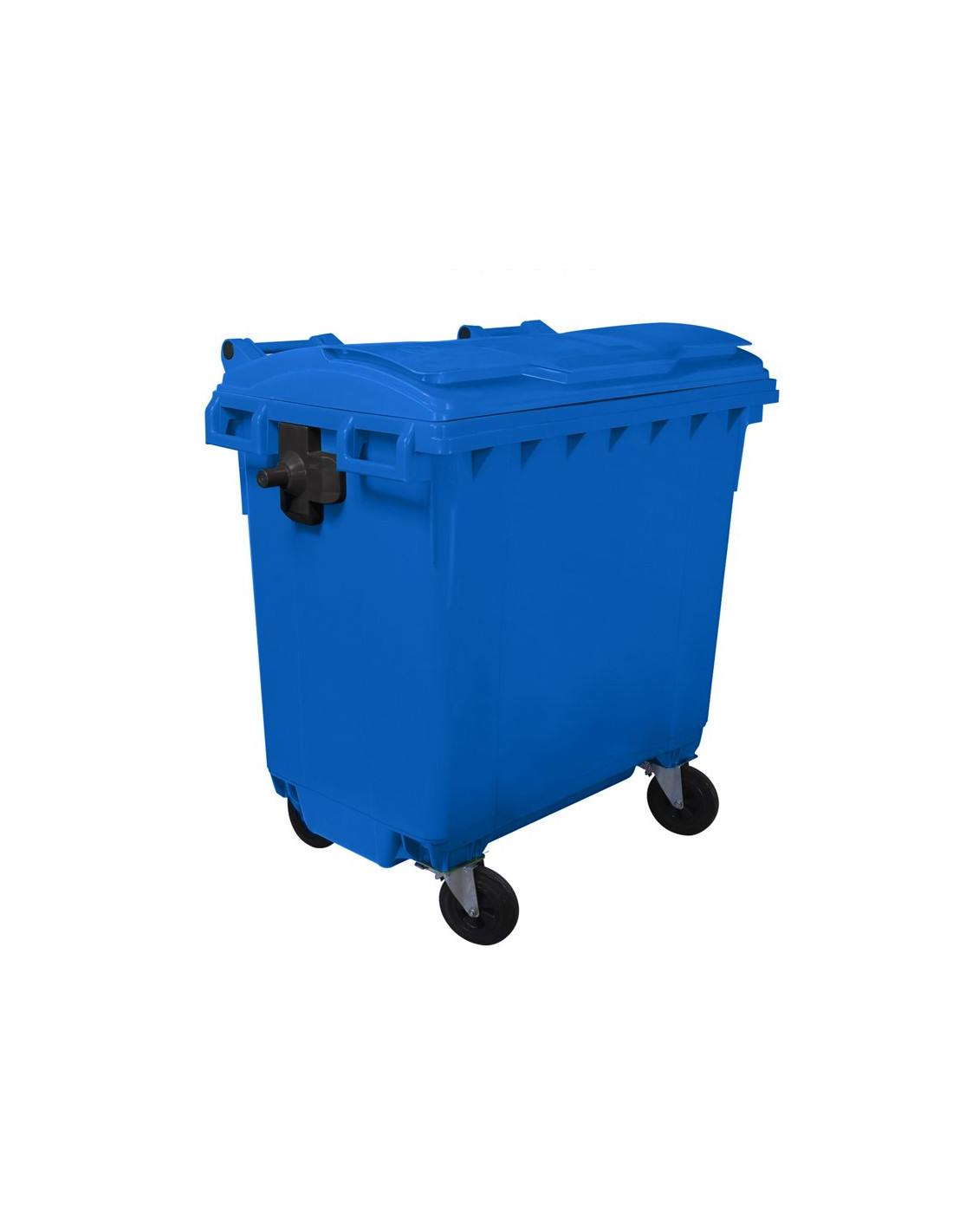 Cassonetto 4 ruote da esterno porta rifiuti in PEHD (Polietilene ad alta densità) con coperchio piano, capacità lt. 770, dotato di quattro ruote in gomma con diametro 200 mm e relativo sistema di bloccaggio.