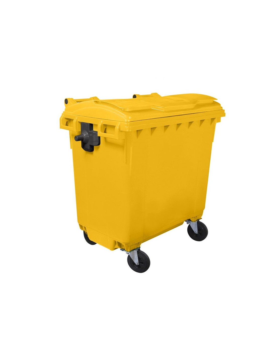 Cassonetto 4 ruote da esterno porta rifiuti in PEHD (Polietilene ad alta densità) con coperchio piano, capacità lt. 770, dotato di quattro ruote in gomma con diametro 200 mm e relativo sistema di bloccaggio.