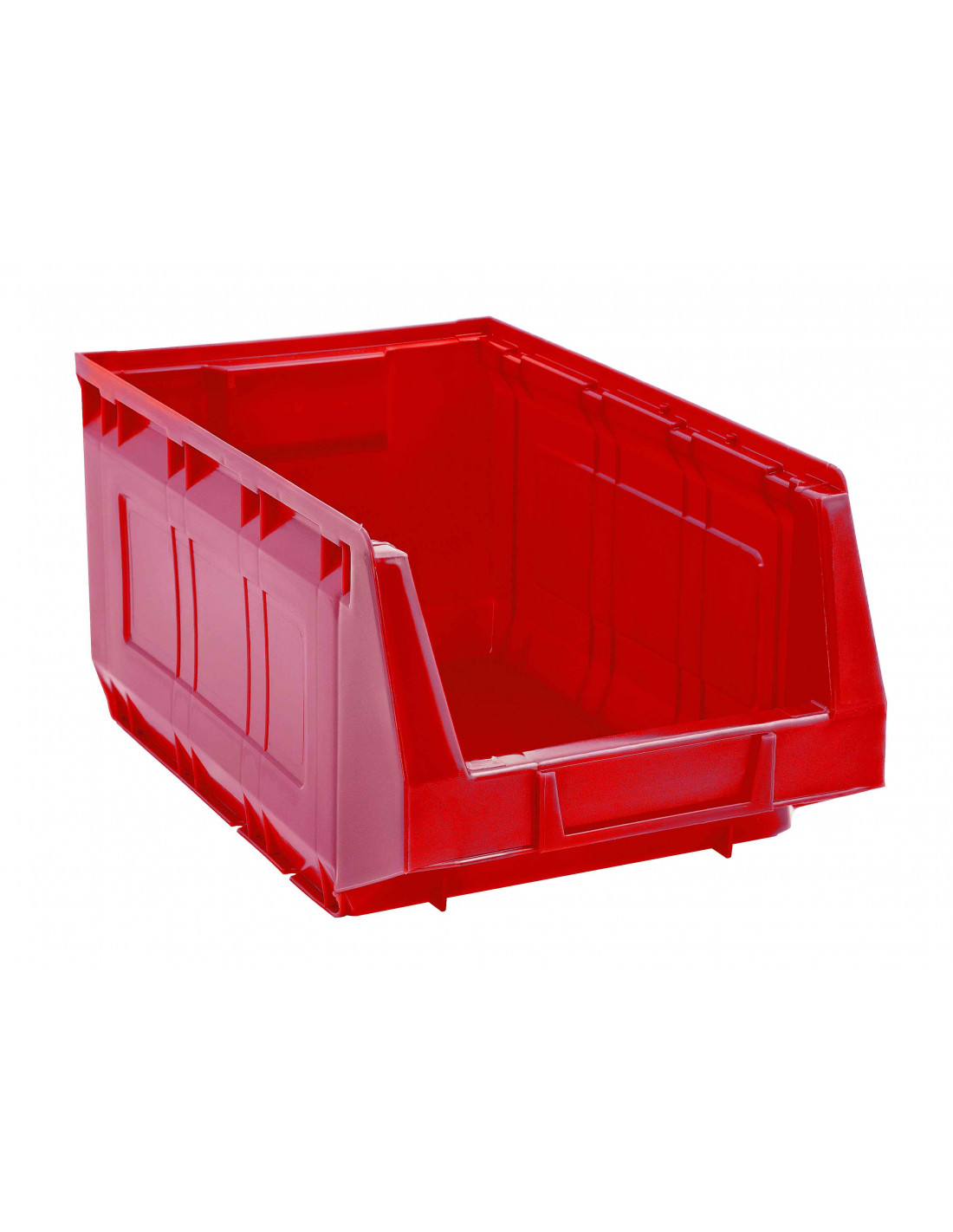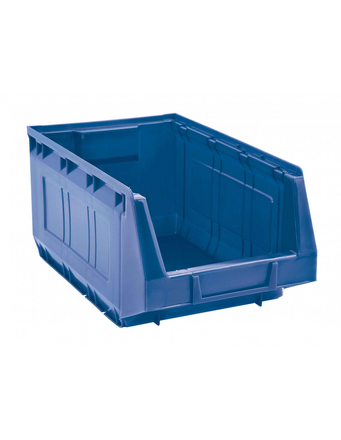 Set di 7 contenitori a bocca di lupo sovrapponibili (impilabili), dotati di linguetta per aggancio nella parte posteriore e realizzati in PEHD. Disponibili nei colori: blu, giallo, grigio, rosso o verde.