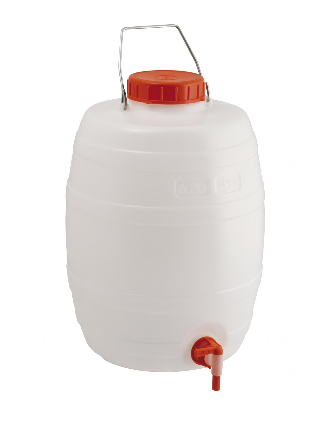 Fustino a botticella in PEHD (Polietilene ad alta densità) bianco neutro con manico in acciaio, coperchio, tappo e rubinetto da ¼ pollici in PP (Polipropilene) rosso dotato di guarnizione in gomma alimentare e idoneo al contatto con alimenti.