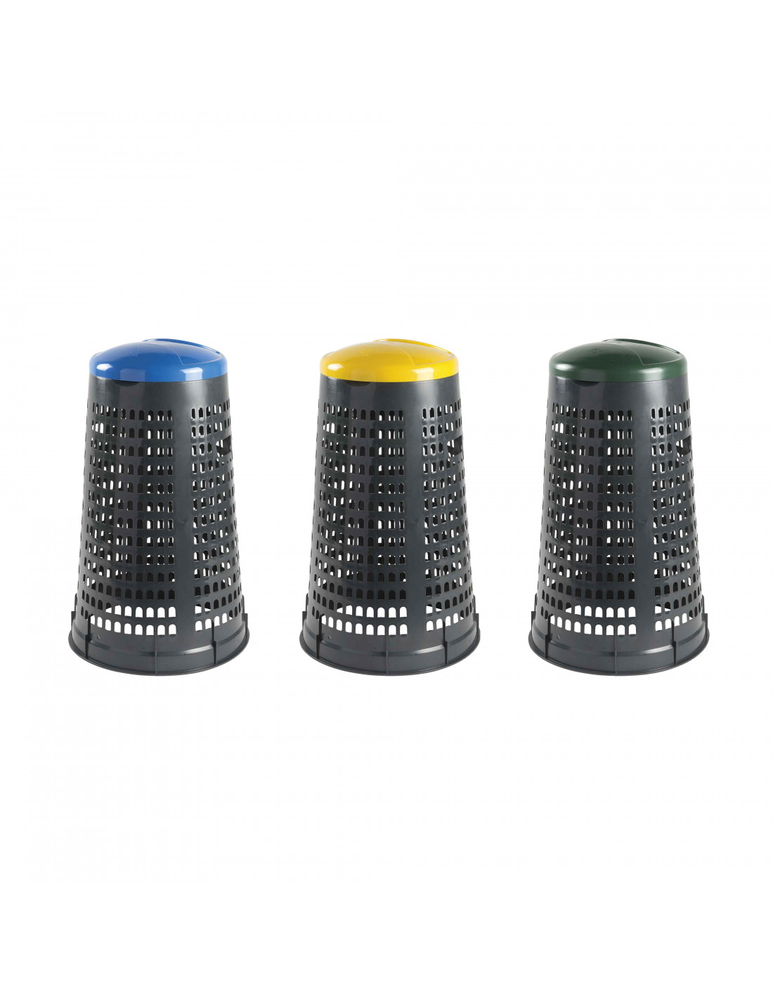 Set con 3 trespoli leggeri e facilmente sollevabili, pratici e semplici da utilizzare in PEHD (Polietilene ad alta densità) con fondo grigio e coperchio colorato: blu, giallo, rosso o verde.