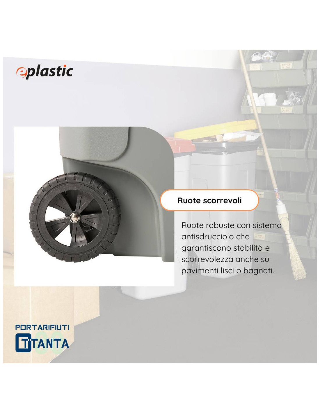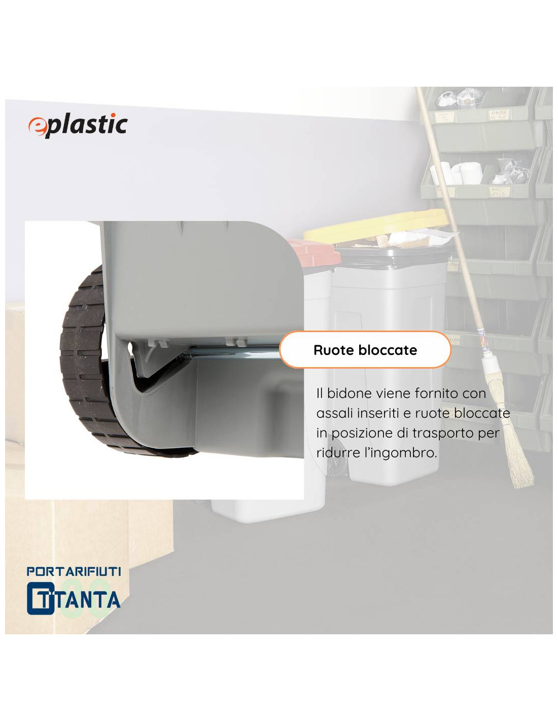 Pratico bidone porta rifiuti da 80 litri con due ruote e coperchio ad apertura 120°, realizzato in PP (copolimero di Polipropilene) con design moderno e funzionale.