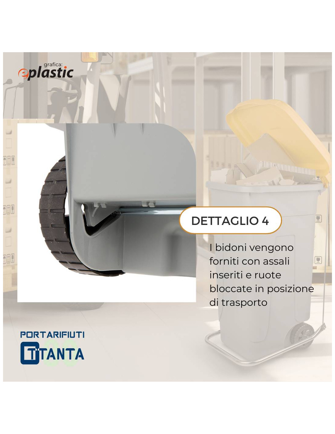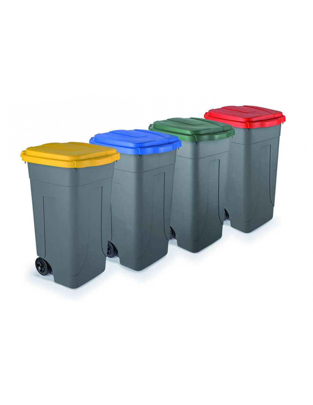 Set 4 bidoni carrellati, da 80 litri, a due ruote per raccolta differenziata in PP (polipropilene) con fondo grigio e coperchio colorato