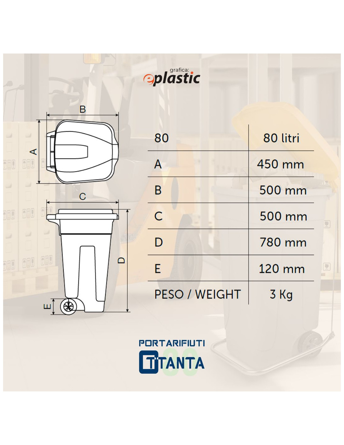 Pratico bidone porta rifiuti da 80 litri con due ruote e coperchio ad apertura 120°, realizzato in PP (copolimero di Polipropilene) con design moderno e funzionale.