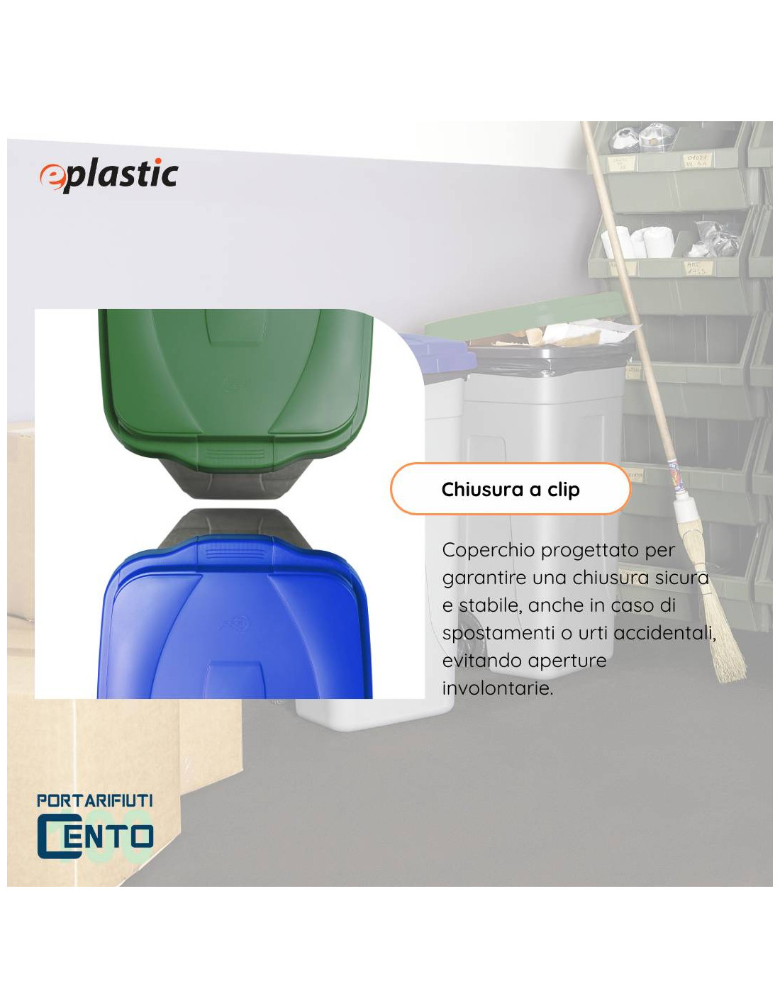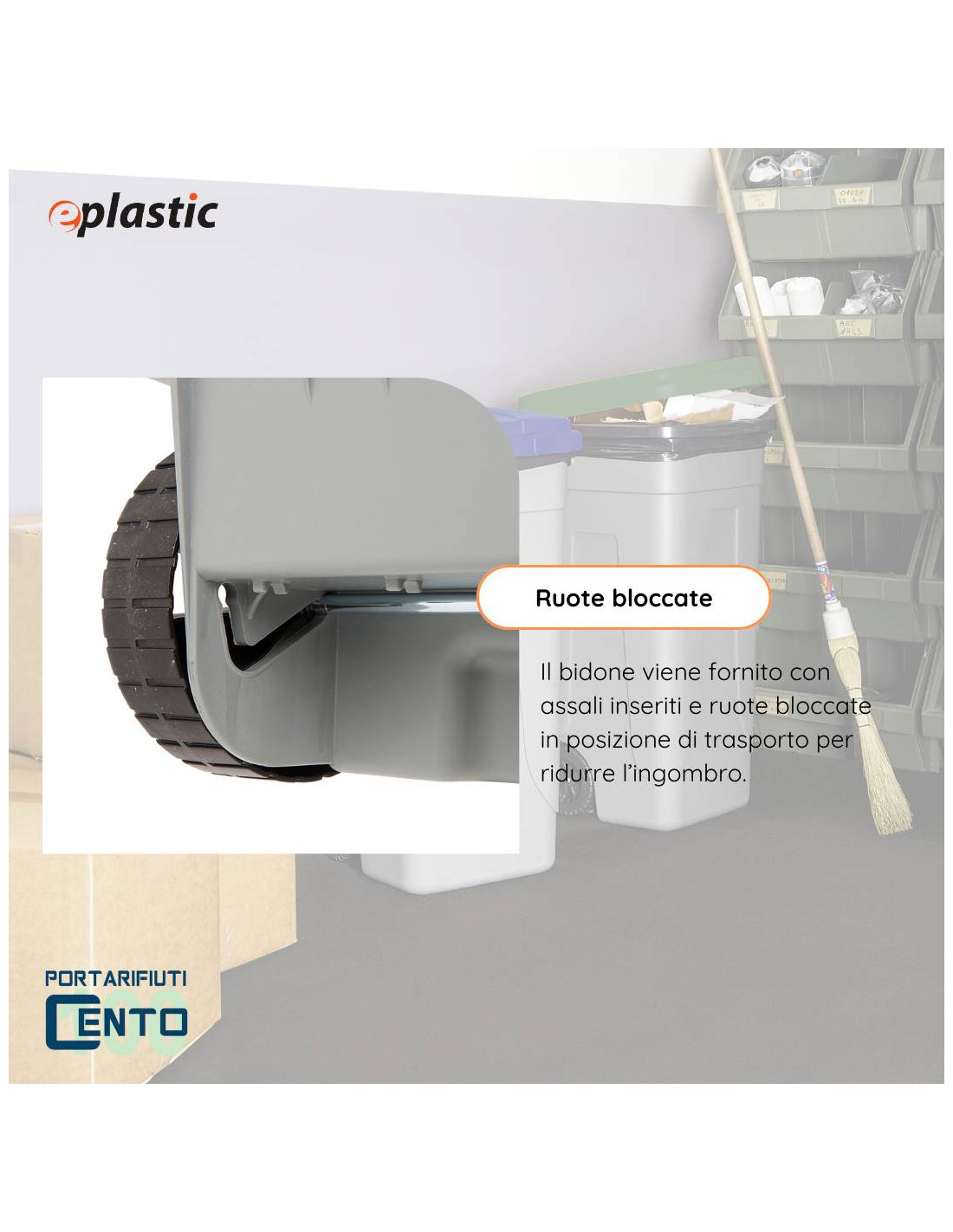 Pratico bidone porta rifiuti da 100 litri con due ruote e coperchio ad apertura 270°, realizzato in PP (copolimero di Polipropilene) con design moderno e funzionale.