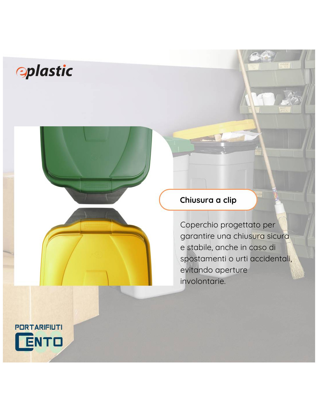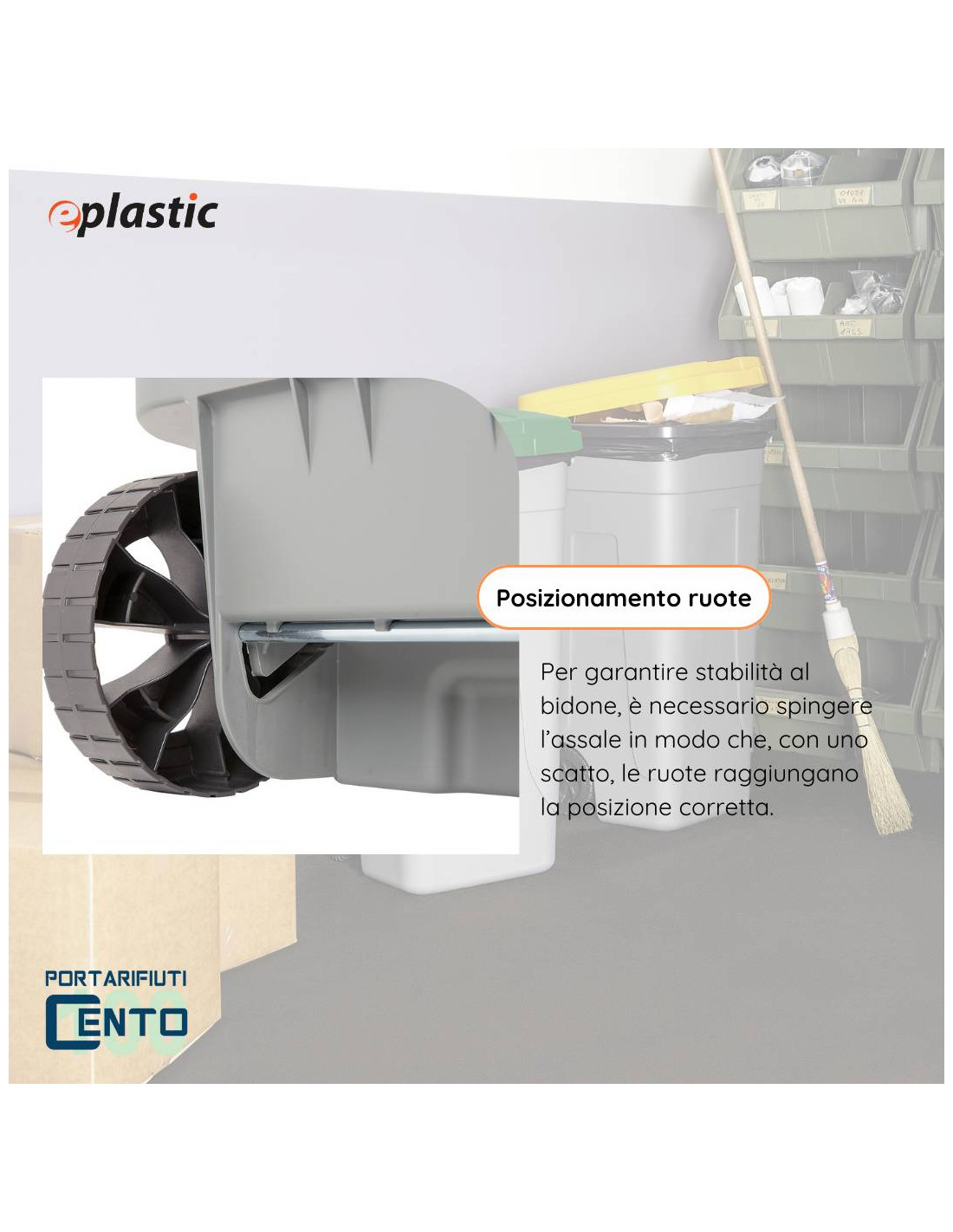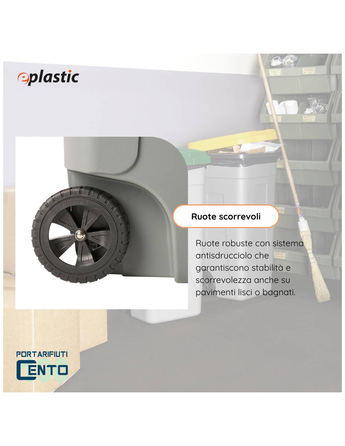 Pratico bidone porta rifiuti da 100 litri con due ruote e coperchio ad apertura 270°, realizzato in PP (copolimero di Polipropilene) con design moderno e funzionale.
