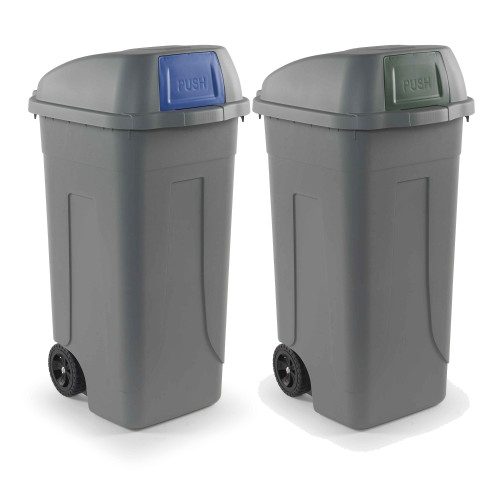 Set 2 bidoni carrellati, da 100 litri, a due ruote per raccolta differenziata in PP (polipropilene) con corpo grigio e coperchi con sportellini basculanti colorati: blu, giallo, rosso o verde