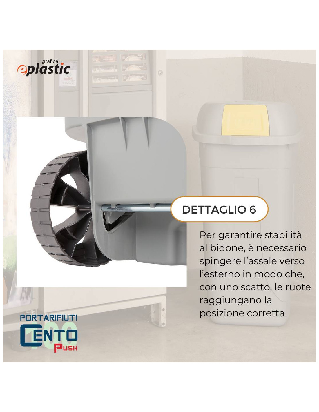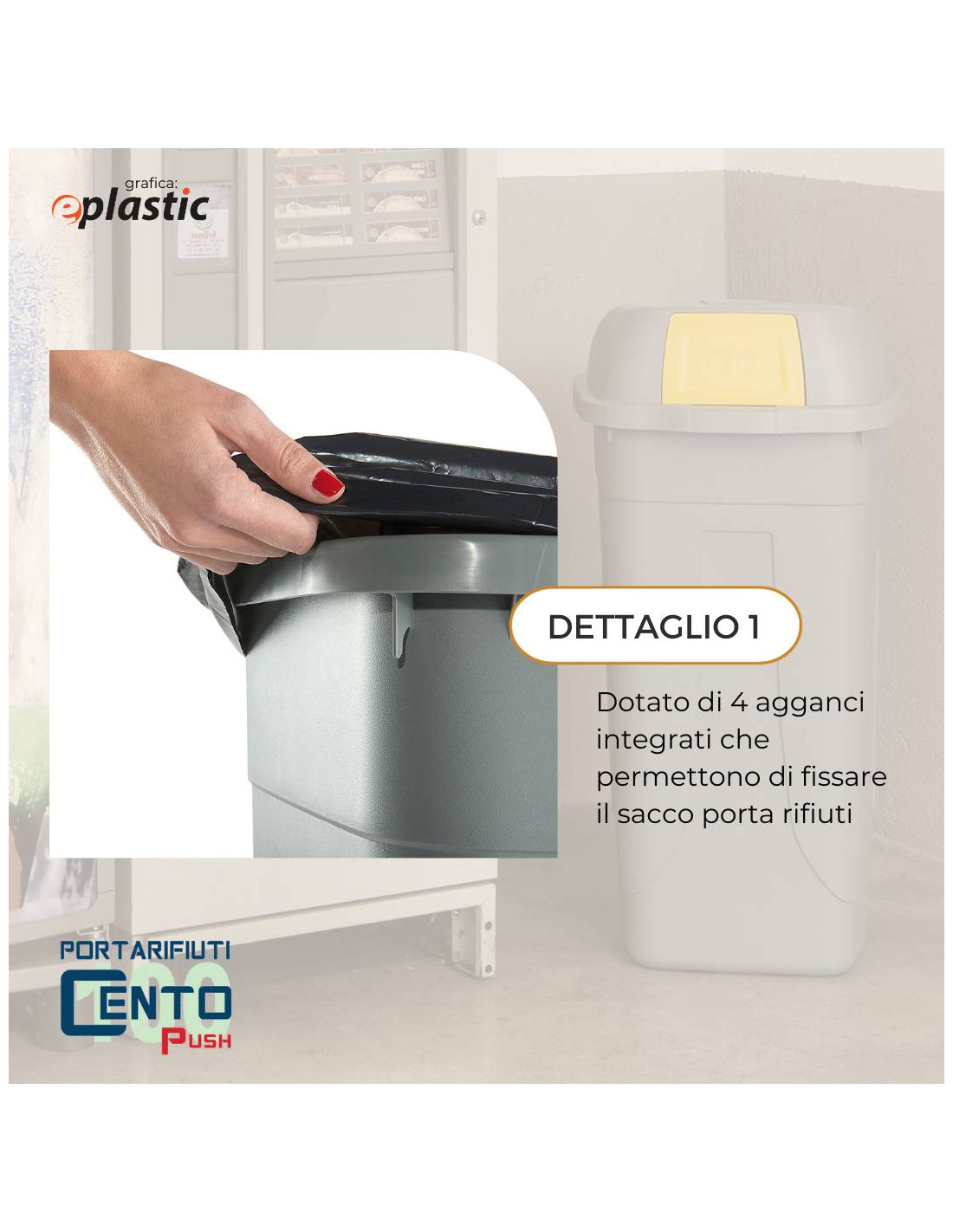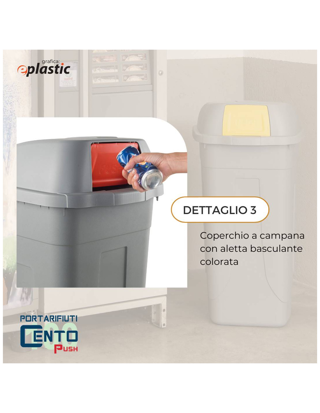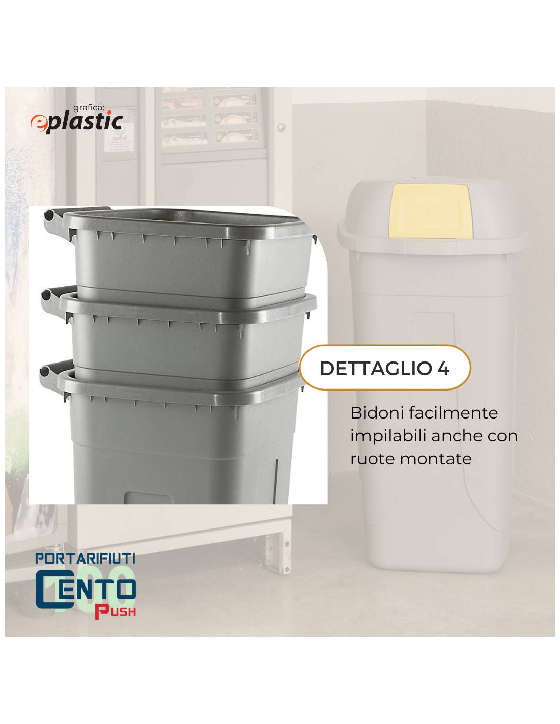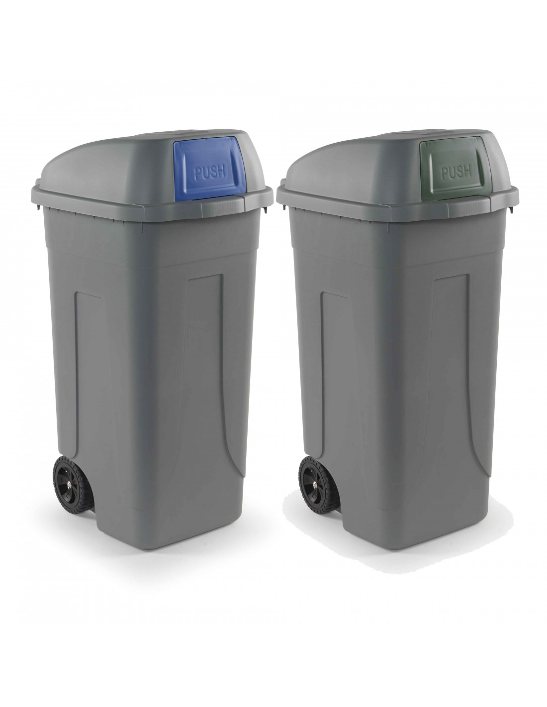 Set 2 bidoni carrellati a due ruote per raccolta differenziata in PP (polipropilene) con corpo grigio e coperchi con sportellini basculanti (l 200 x h 130 mm) colorati: blu, giallo, rosso o verde. Particolarmente adatto per l'utilizzo interno in tutti gli ambienti, il bidone cento-push è facilmente impilabile anche con ruote montate e dotato di maniglia ergonomica rinforzata per facilitarne il trasporto, di coperchio con chiusura a clip e predisposto per l'aggancio di sacchi.