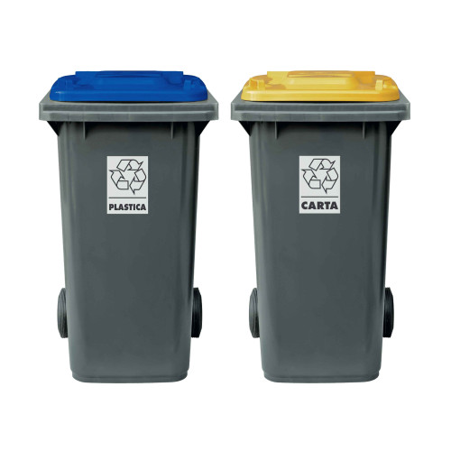 Set 2 bidoni carrellati, da 120 litri, a due ruote per raccolta differenziata in PEHD (Polietilene ad alta densità) con fondo grigio e coperchi colorati: blu, giallo, rosso o verde