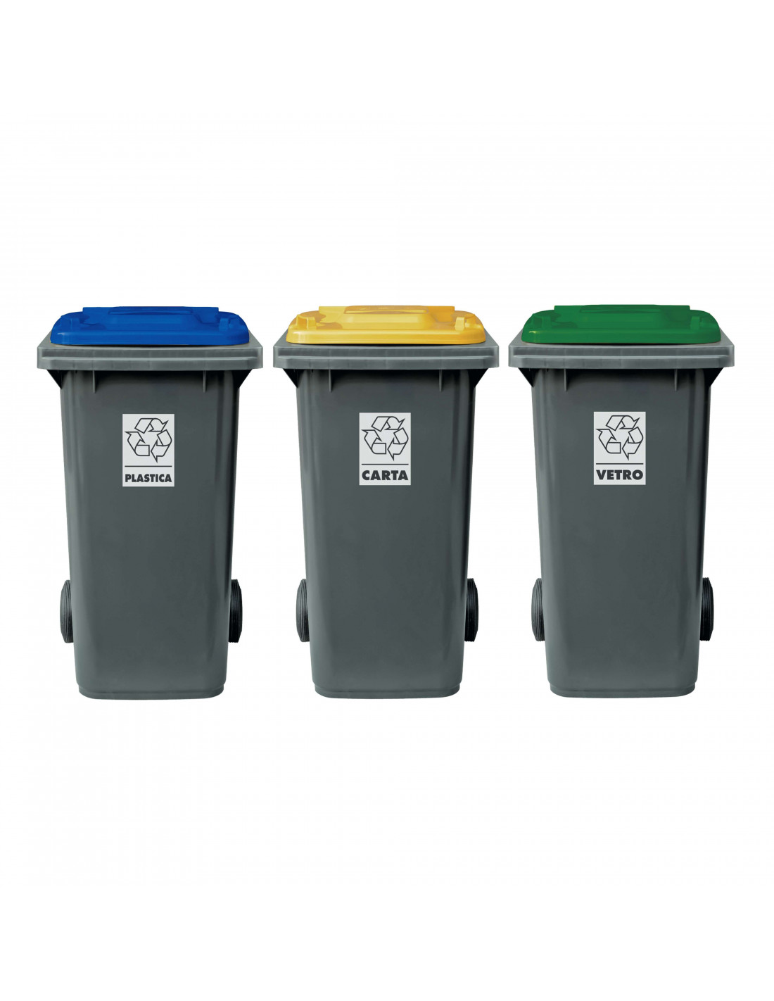 Set 3 bidoni carrellati, da 120 litri, a due ruote per raccolta differenziata in PEHD (Polietilene ad alta densità) con fondo grigio e coperchi colorati: blu, giallo, rosso o verde