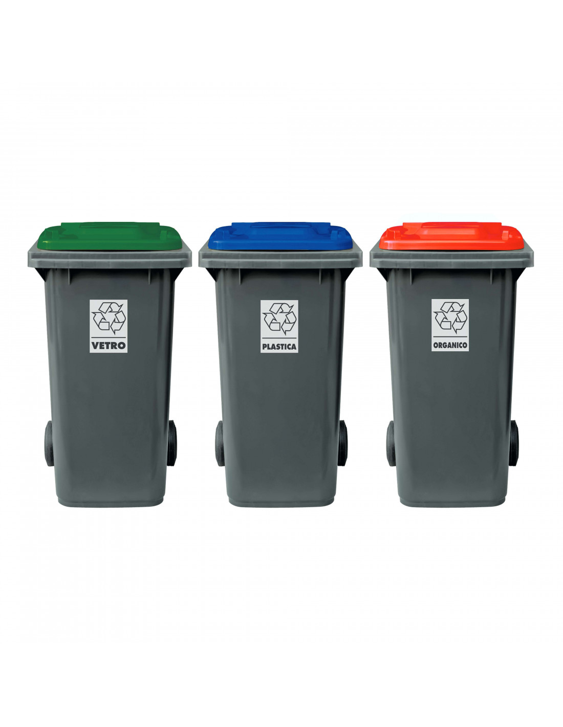 Set 3 bidoni carrellati a due ruote per raccolta differenziata in PEHD (Polietilene ad alta densità) con fondo grigio e coperchi colorati: blu, giallo, rosso o verde. Prodotto certificato TUV in accordo alla norma EN840, resistente agli agenti chimici e non attaccabile dai parassiti. L'articolo non assorbe liquidi ed è interamente lavabile e sterilizzabile. Bidone di classe I e dotato di presa frontale di tipo A e sede per alloggiamento microchip su parte inferiore area frontale.