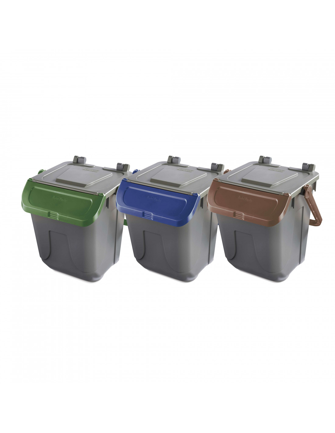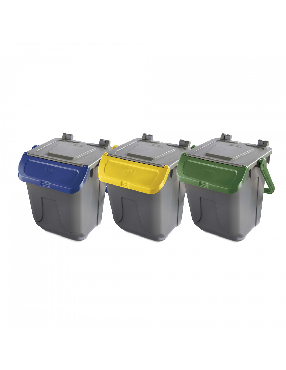 Set 3 bidoni, da 25 litri, con fondo grigio e coperchi basculanti colorati: blu, giallo, rosso o verde.