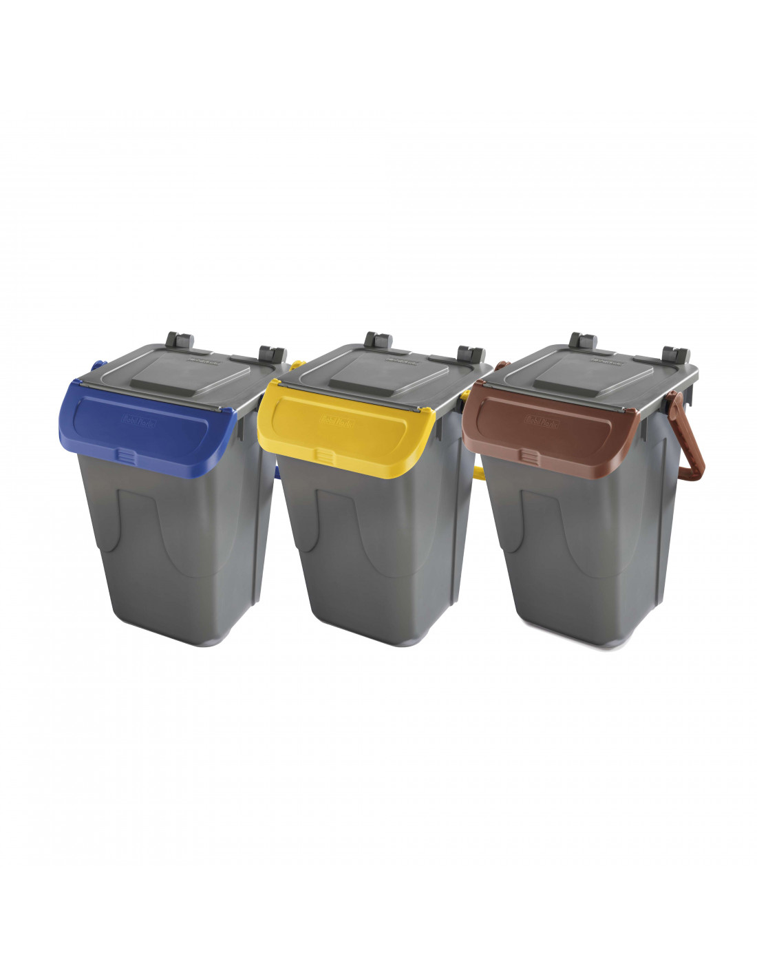 Set 3 bidoni, da 35 litri, con fondo grigio e coperchi basculanti colorati: blu, giallo, marrone o verde.
