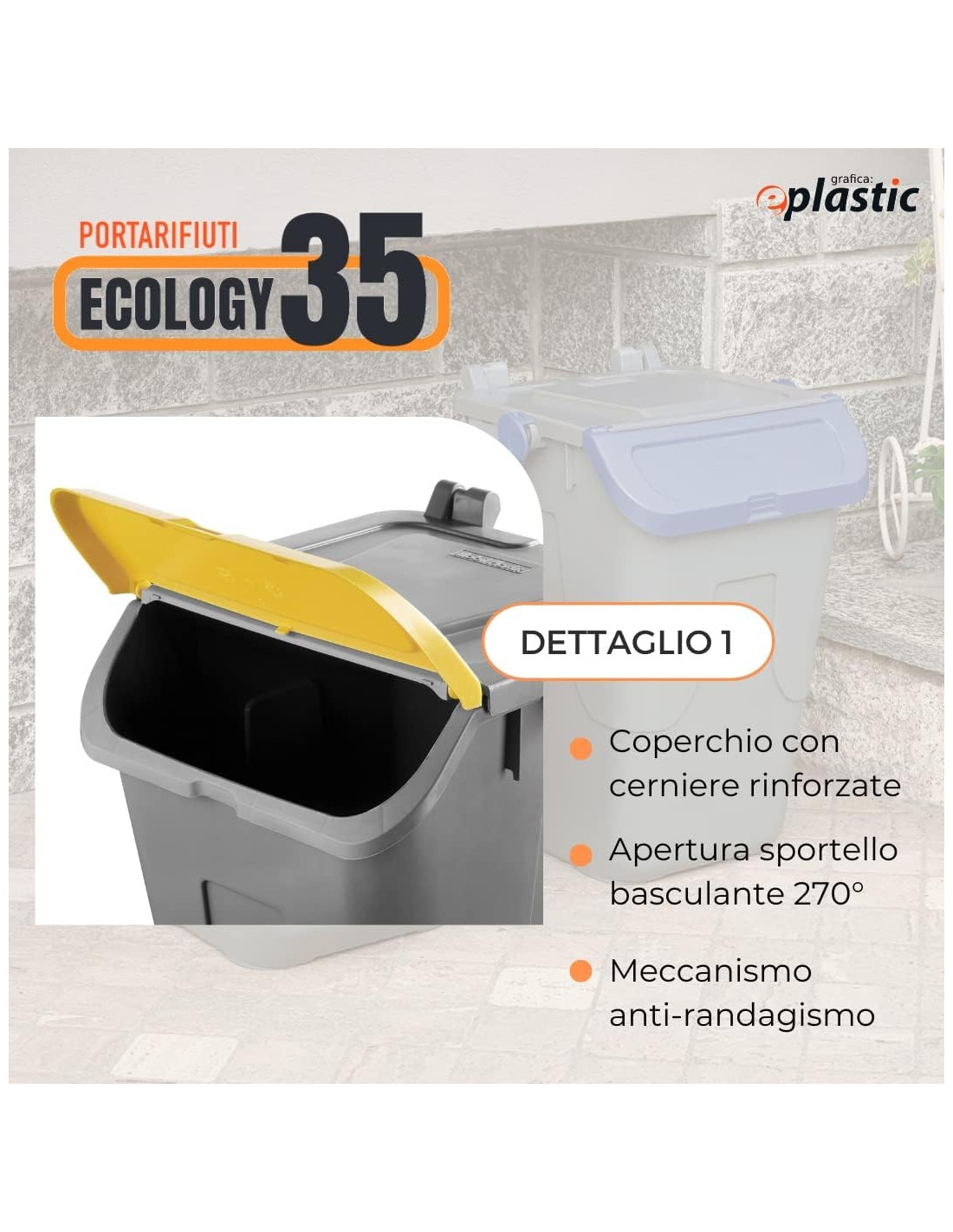 Pratico e robusto contenitore porta rifiuti, ideale per la raccolta differenziata urbana e domestica. Grazie al suo design moderno, alla sua funzionalità e alle sue dimensioni, si adatta perfettamente a tutti gli ambienti. L'articolo è dotato di: sportello basculante a becco, coperchio con cerniere rinforzate per apertura a 270° e meccanismo antirandagismo e maniglione ergonomico con possibilità di blocco verticale. Ecology è realizzato in PP (compound di polipropilene), riciclabile al 100% e resistente agli agenti atmosferici, chimici, e ai raggi UV che lo rendono quindi idoneo anche all'utilizzo esterno intensivo e prolungato. La struttura del bidone è totalmente priva di spigoli, per cui molto più facile da pulire ed igienizzare. I bidoni della linea Ecology sono impilabili ed inseribili tra loro e dotati anche di predisposizione per RFDI.