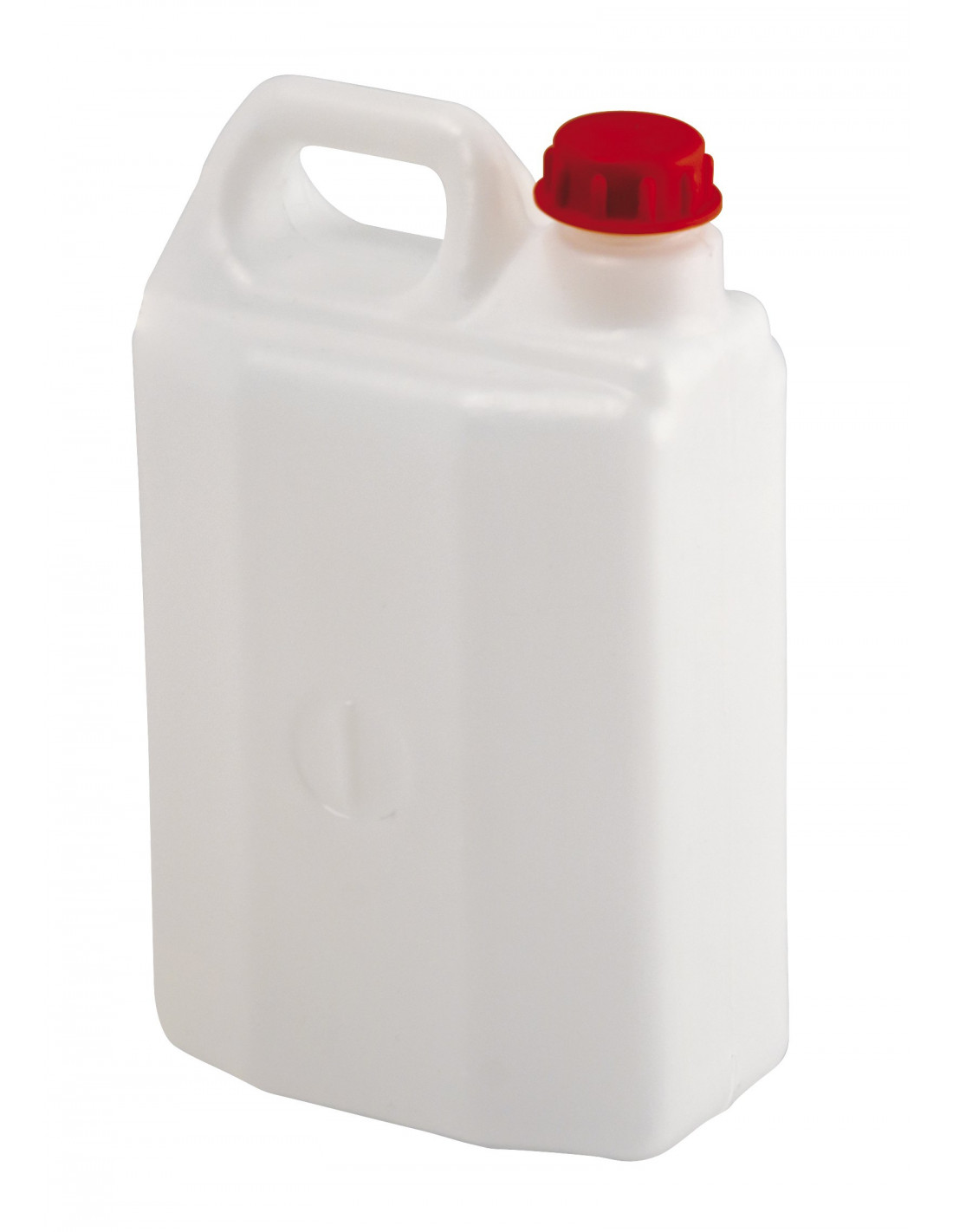 Tanica in PEHD (Polietilene ad alta densità) neutro con tappo in PP (Polipropilene) rosso ideale per trasporto liquidi e idonea al contatto con alimenti.