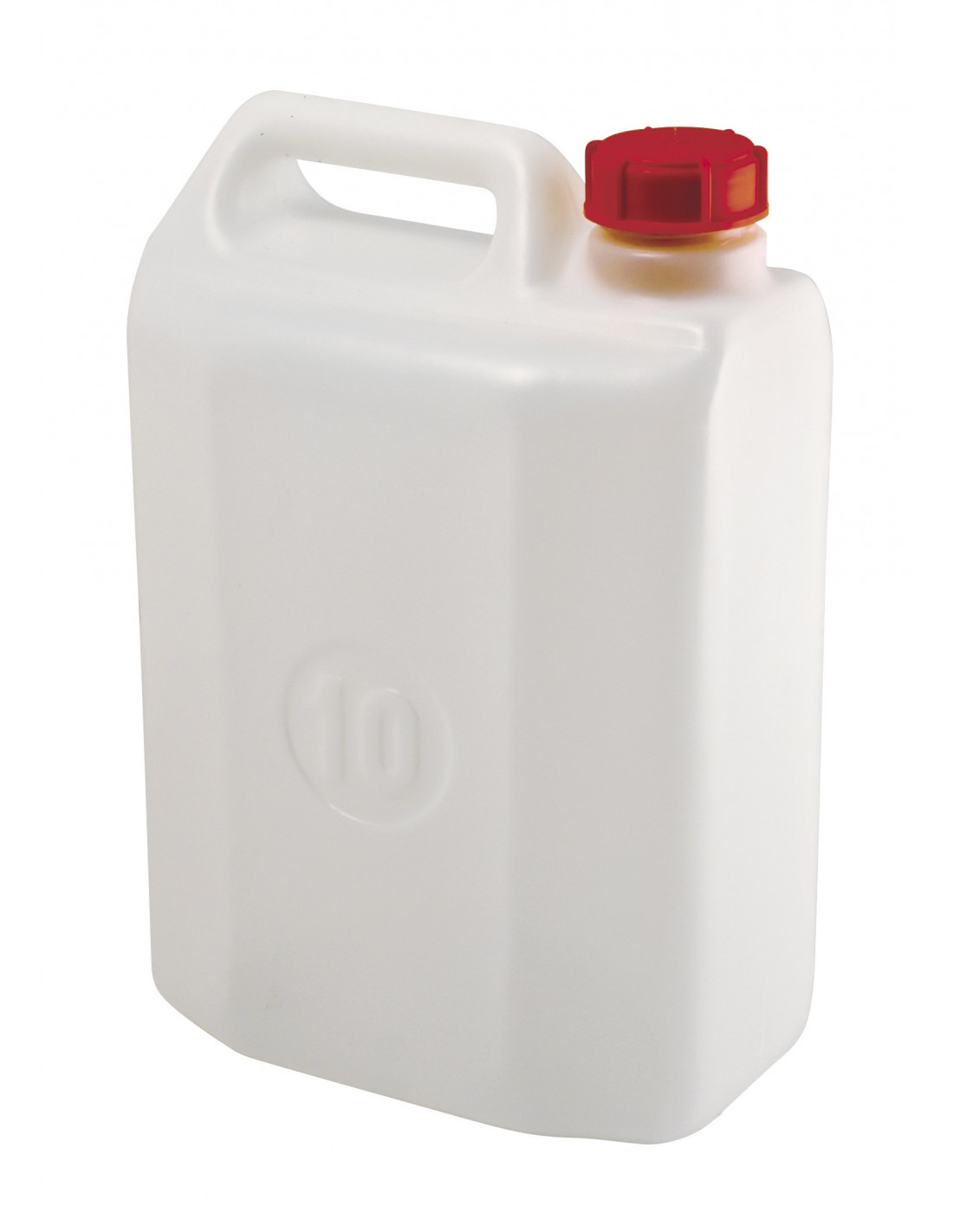 Tanica in PEHD (Polietilene ad alta densità) neutro con tappo in PP (Polipropilene) rosso ideale per trasporto liquidi e idonea al contatto con alimenti.