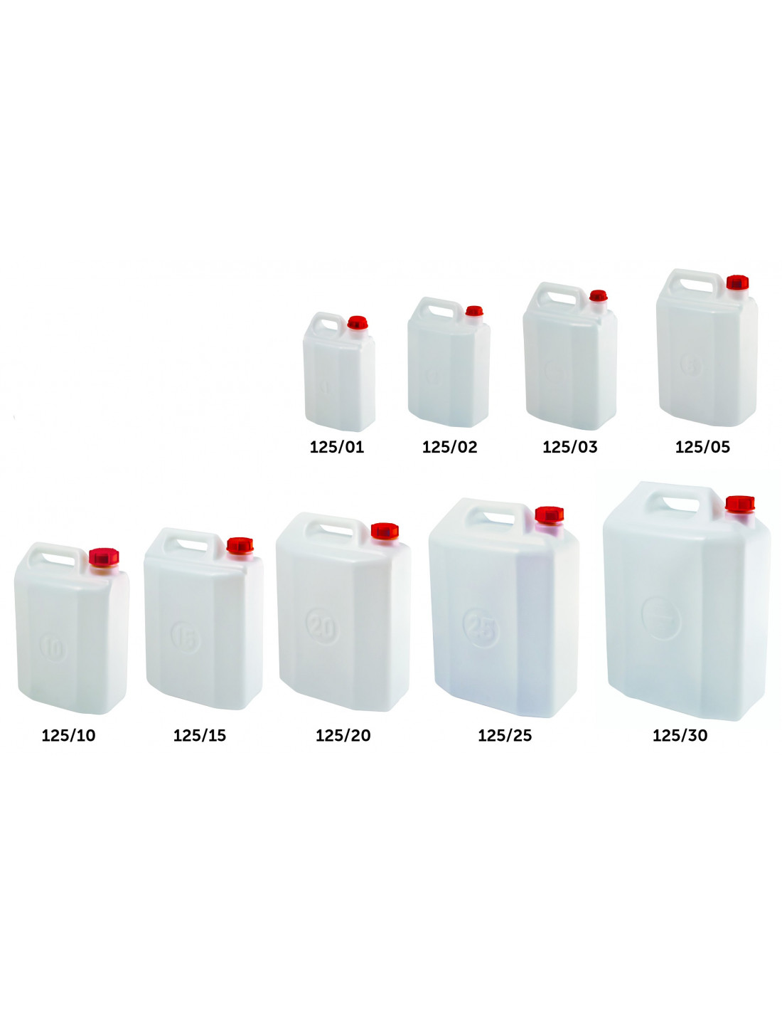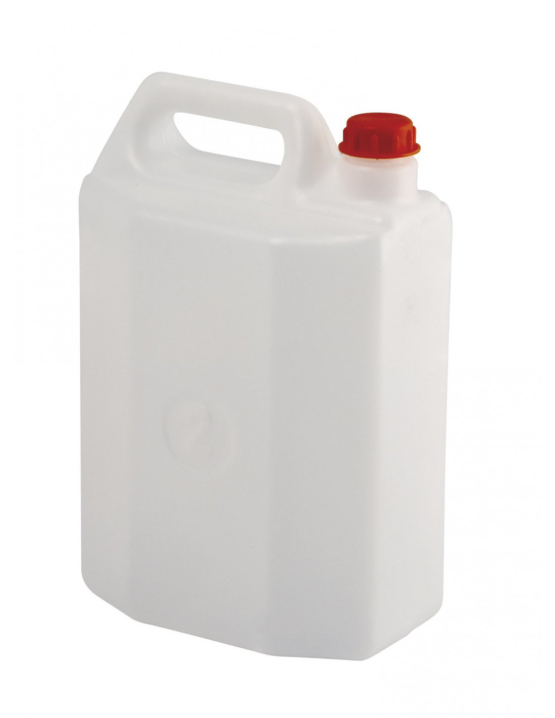 Tanica in PEHD (Polietilene ad alta densità) neutro con tappo in PP (Polipropilene) rosso ideale per trasporto liquidi e idonea al contatto con alimenti.
