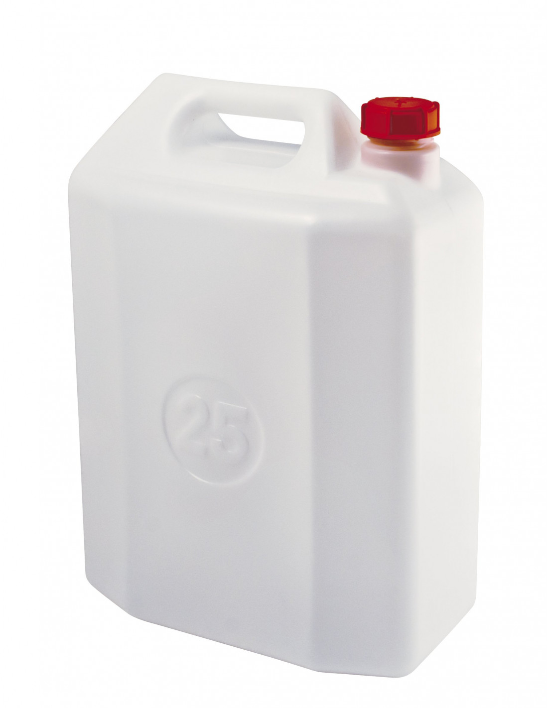Tanica in PEHD (Polietilene ad alta densità) neutro con tappo in PP (Polipropilene) rosso ideale per trasporto liquidi e idonea al contatto con alimenti.