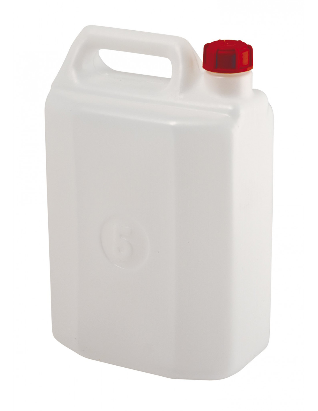 Tanica in PEHD (Polietilene ad alta densità) neutro con tappo in PP (Polipropilene) rosso ideale per trasporto liquidi e idonea al contatto con alimenti.