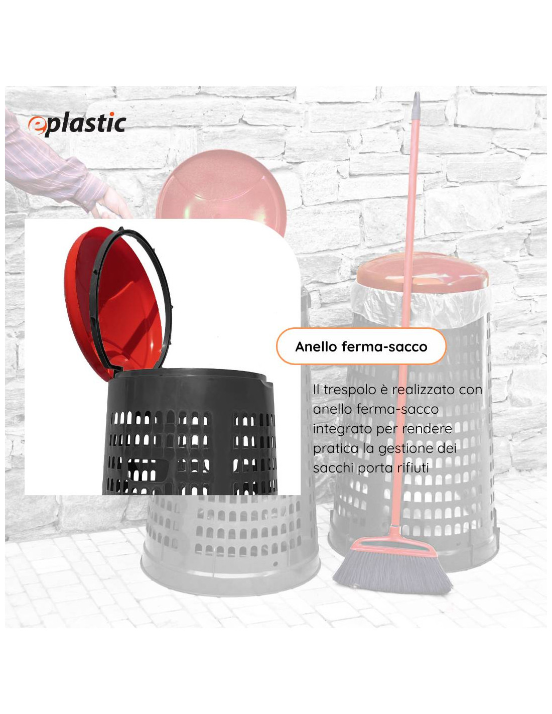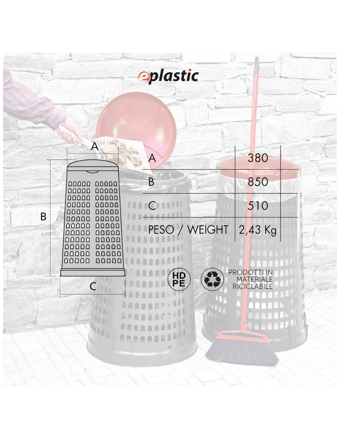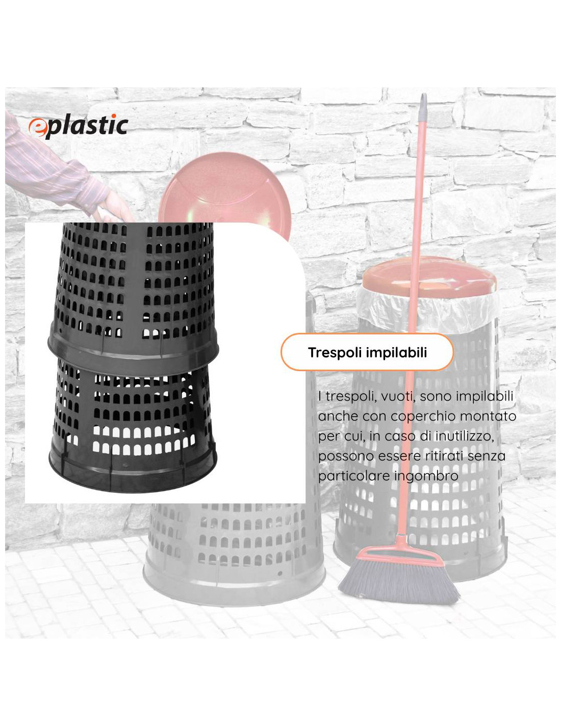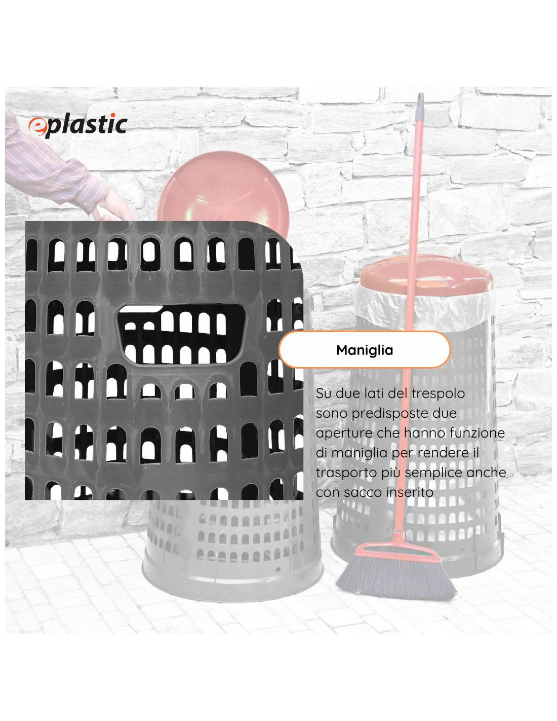 Trespolo leggero e facilmente sollevabile, pratico e semplice da utilizzare in PEHD (Polietilene ad alta densità) con fondo grigio e coperchio colorato: blu, giallo, rosso o verde. Il prodotto è estremamente versatile e adatto a qualsiasi tipo di rifiuto perché prevede l'utilizzo di sacchi per immondizia che possono essere facilmente fissati mediante l'apposito anello ferma sacco. Il fatto che non abbia contatto diretto con i rifiuti lo rende ancor più facilmente lavabile e sterilizzabile.