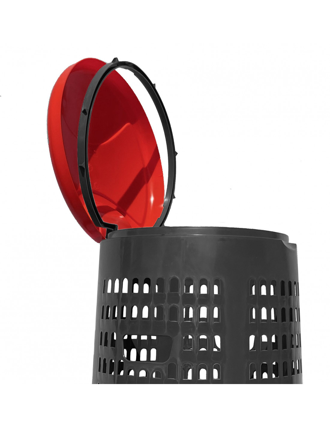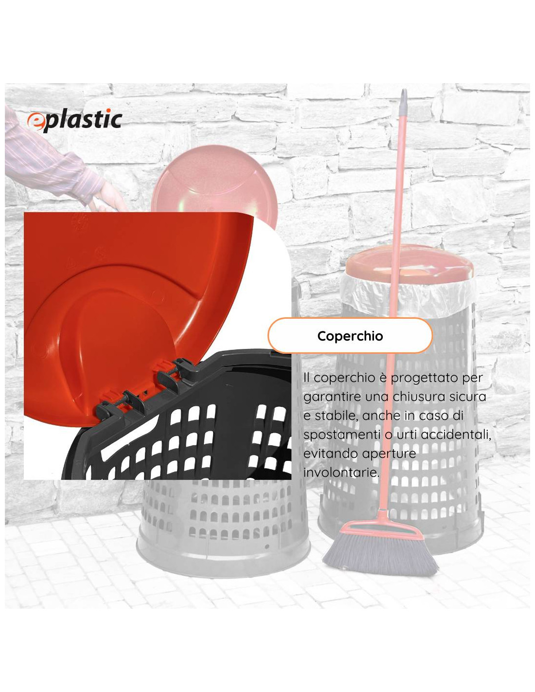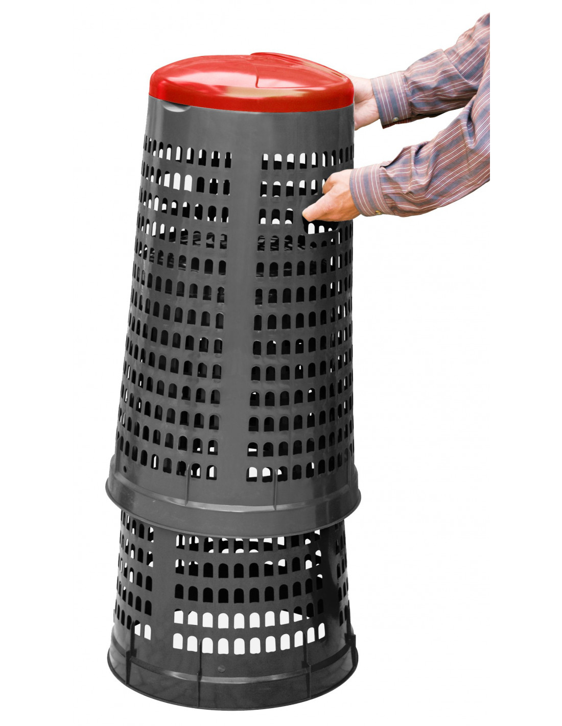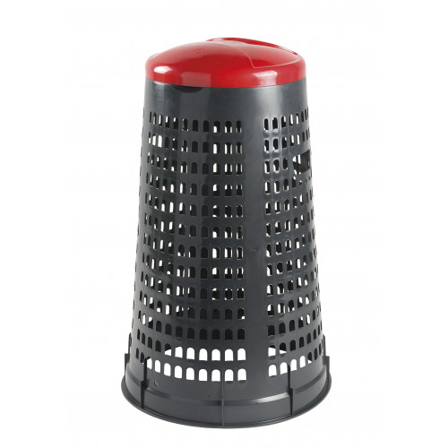 Trespolo leggero e facilmente sollevabile, pratico e semplice da utilizzare in PEHD (Polietilene ad alta densità) con fondo grigio e coperchio colorato: blu, giallo, rosso o verde. Il prodotto è estremamente versatile e adatto a qualsiasi tipo di rifiuto perché prevede l'utilizzo di sacchi per immondizia che possono essere facilmente fissati mediante l'apposito anello ferma sacco. Il fatto che non abbia contatto diretto con i rifiuti lo rende ancor più facilmente lavabile e sterilizzabile.