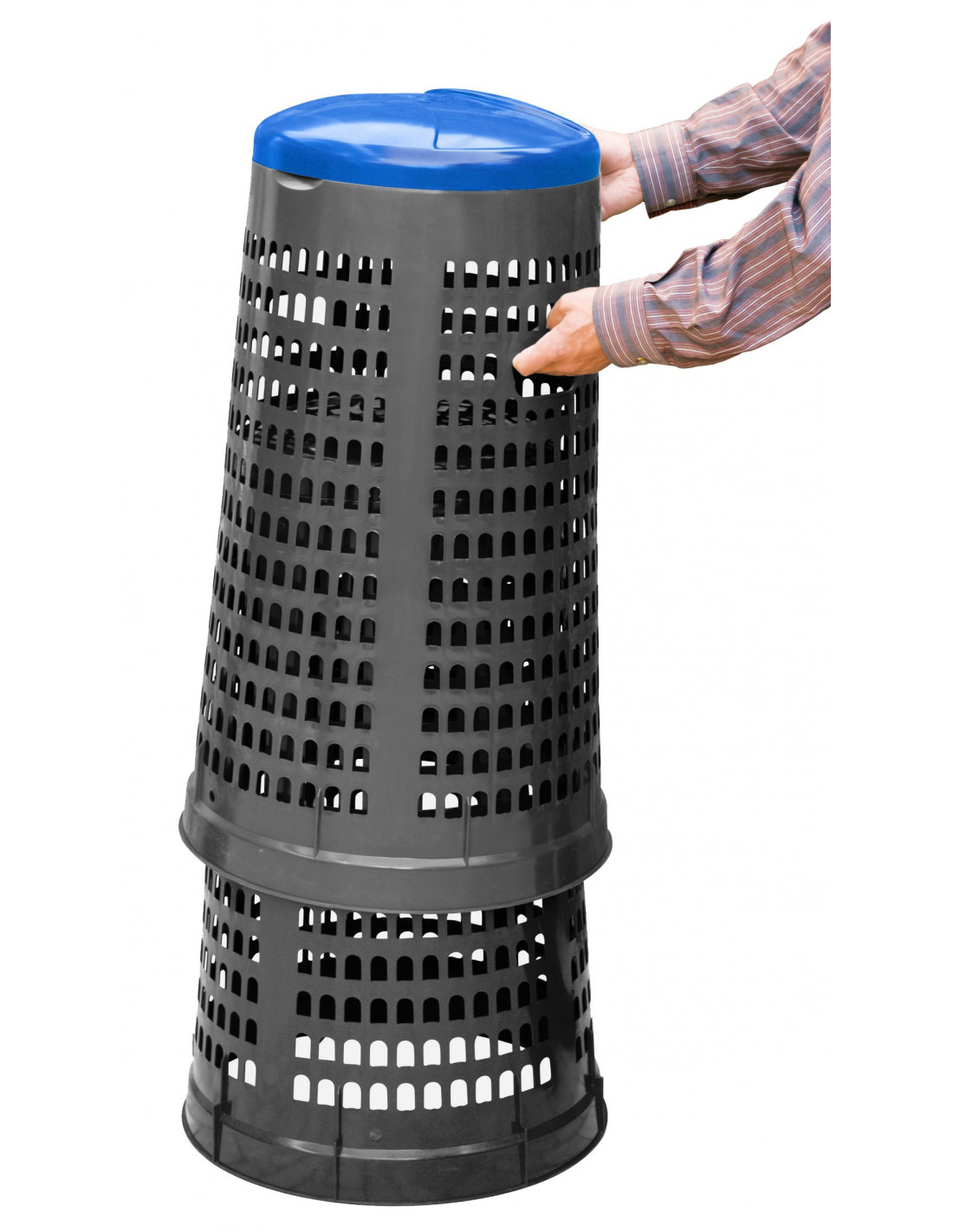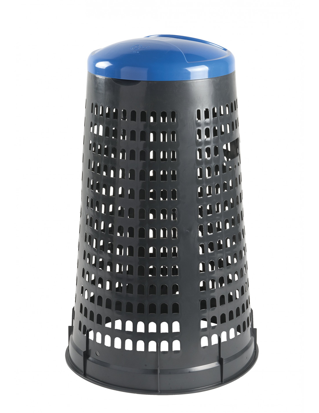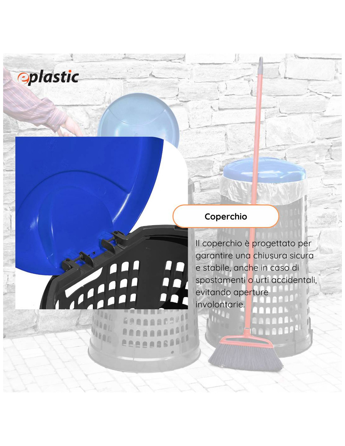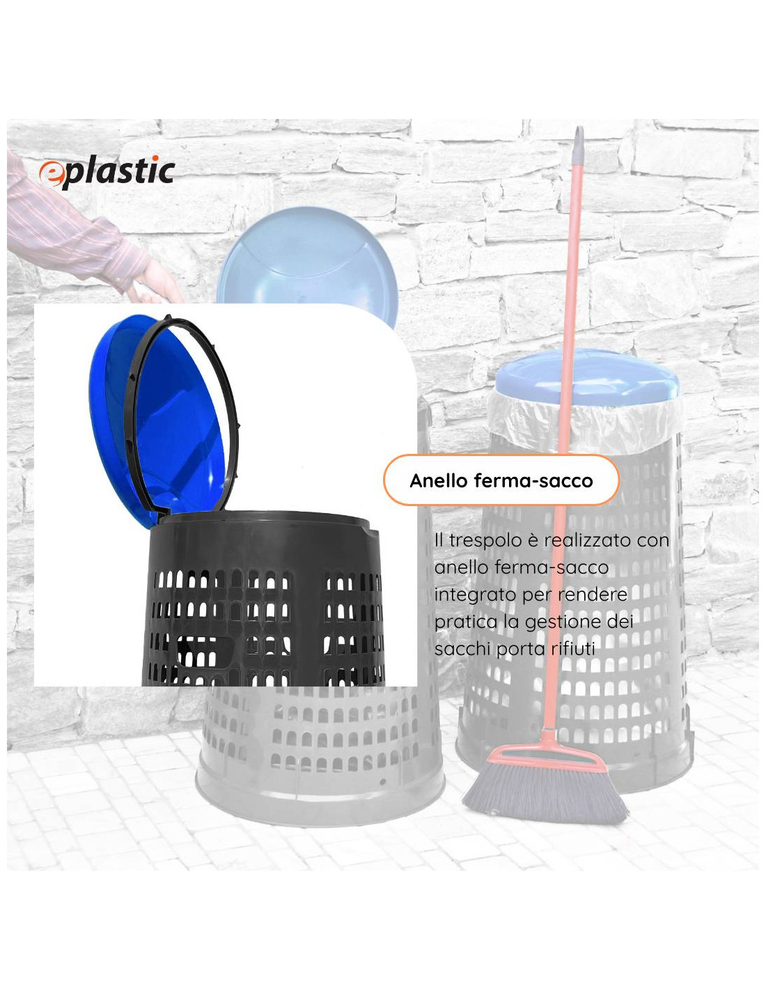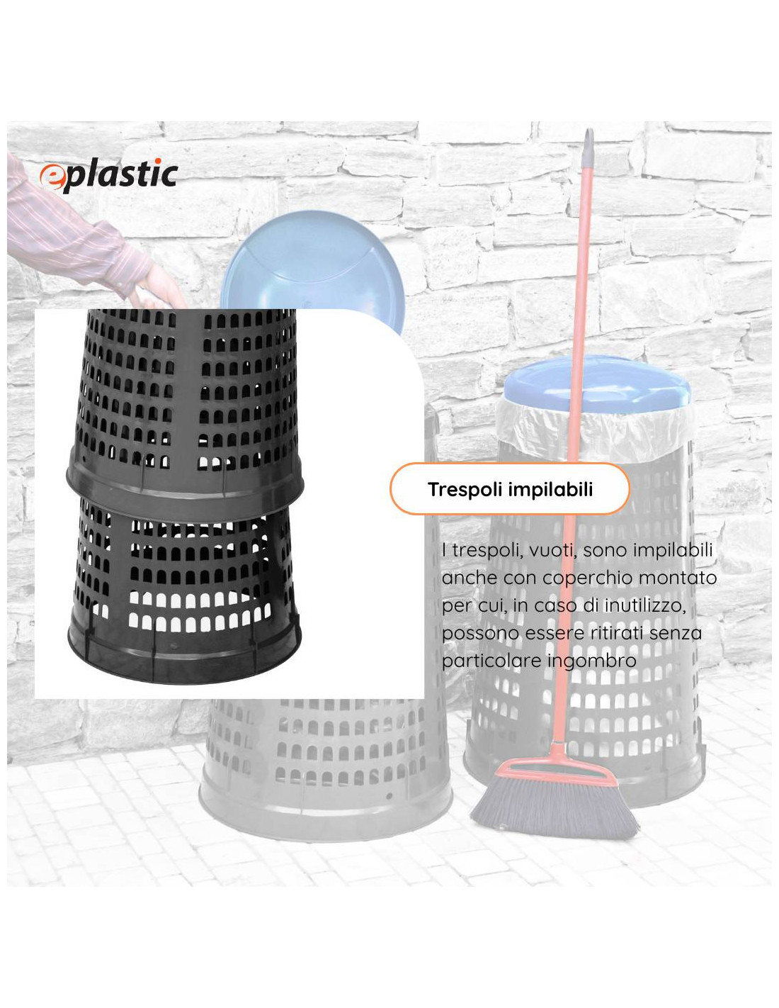 Trespolo leggero e facilmente sollevabile, pratico e semplice da utilizzare in PEHD (Polietilene ad alta densità) con fondo grigio e coperchio colorato: blu, giallo, rosso o verde. Il prodotto è estremamente versatile e adatto a qualsiasi tipo di rifiuto perché prevede l'utilizzo di sacchi per immondizia che possono essere facilmente fissati mediante l'apposito anello ferma sacco. Il fatto che non abbia contatto diretto con i rifiuti lo rende ancor più facilmente lavabile e sterilizzabile.
